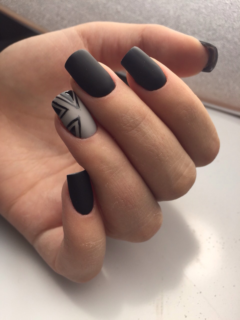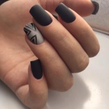 - Matte manicure in gray-black colors looks pretty strict, but unusual. The image is complemented by interesting geometric patterns that will not allow the manicure to be too elaborate. From this design emanates nobility, elegance and grace. Perfect for work and serious events. It does not look festive, but will look decent with a little black dress or a beautiful evening dress.