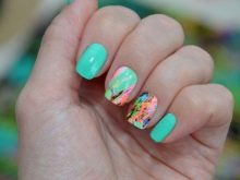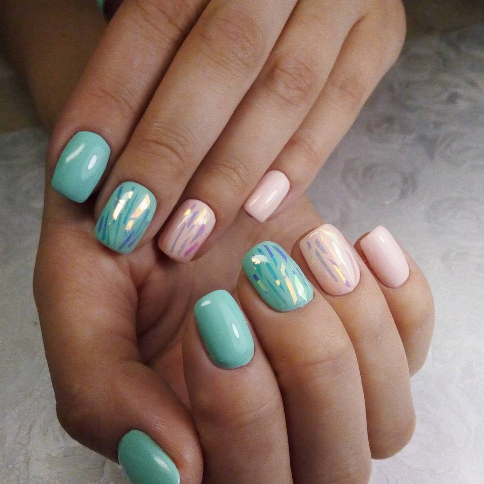 This technique today is one of the most trending. On the mint background, the drawing that she gives looks particularly beautiful and impressive, this design attracts enthusiastic views of others. They create this effect by applying a special film, which is cut into small pieces, and then fixed on the accent nails, putting the elements close to each other. It is worth noting that this design looks particularly realistic on the coating of a light shade.