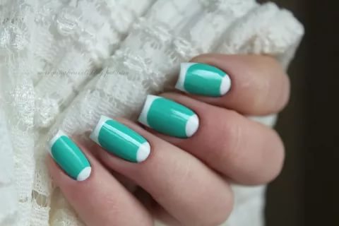 French manicure in mint color - ideal for everyday women's bows. The bow or the so-called smile can be made with white lacquer or a black line, silver. Given the modern french asymmetry, it can resemble a diagonal line, as well as a gradient imitation stretching to the middle of the nail plate.