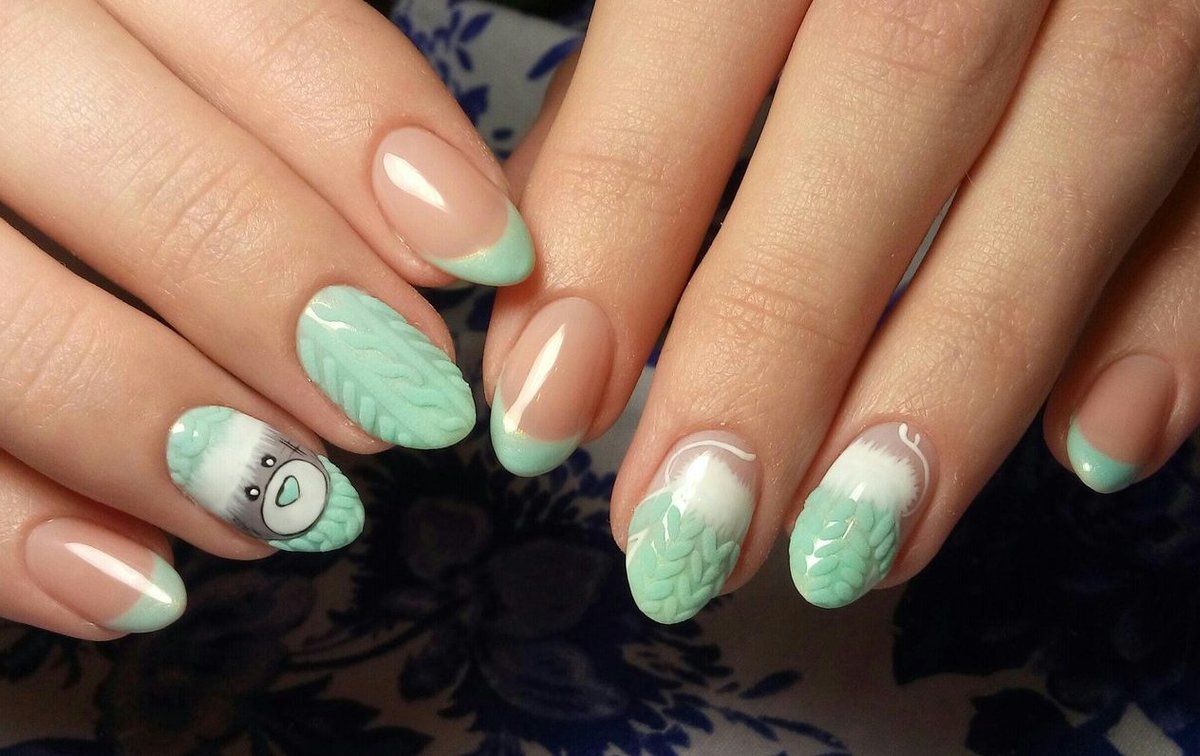 Popular marshmallow designs, which depict ice cream, juicy fruits, cats, Teddy bears, as well as all sorts of bunnies. Beautifully look on a dark mint background manicure snowflakes, made with the use of acrylic powder, as well as patterns of knitted fabrics.