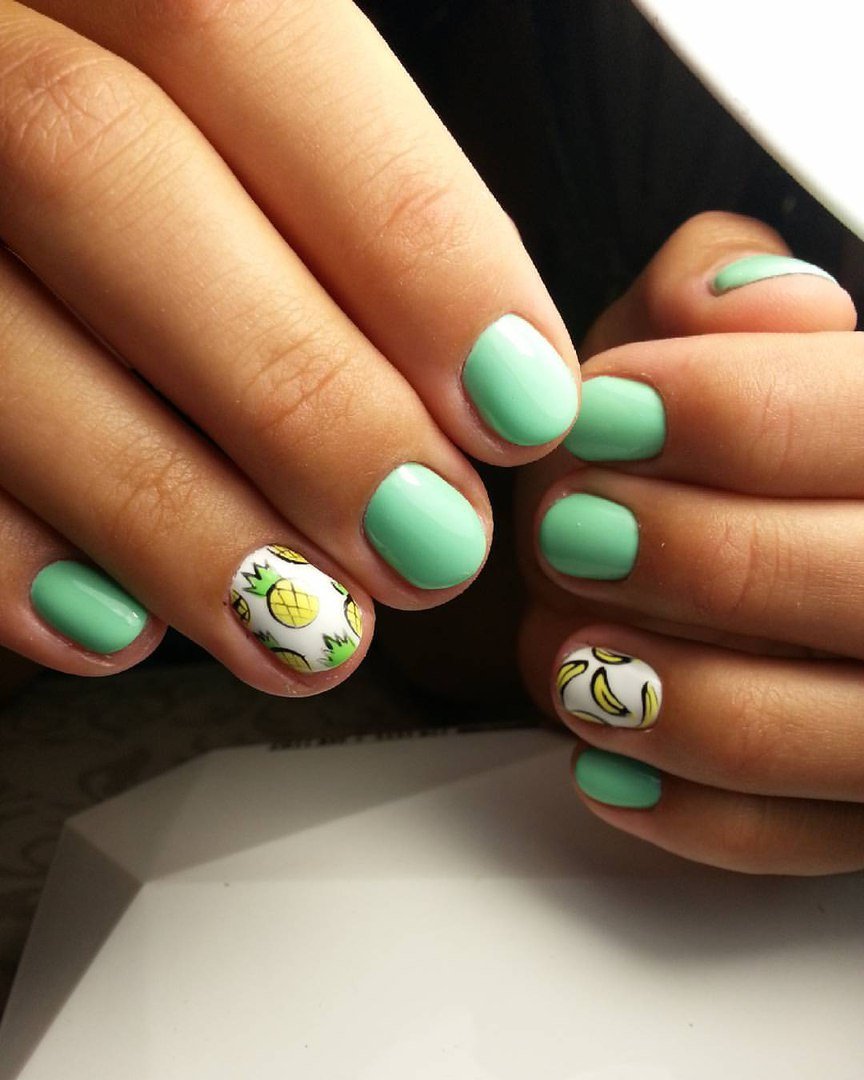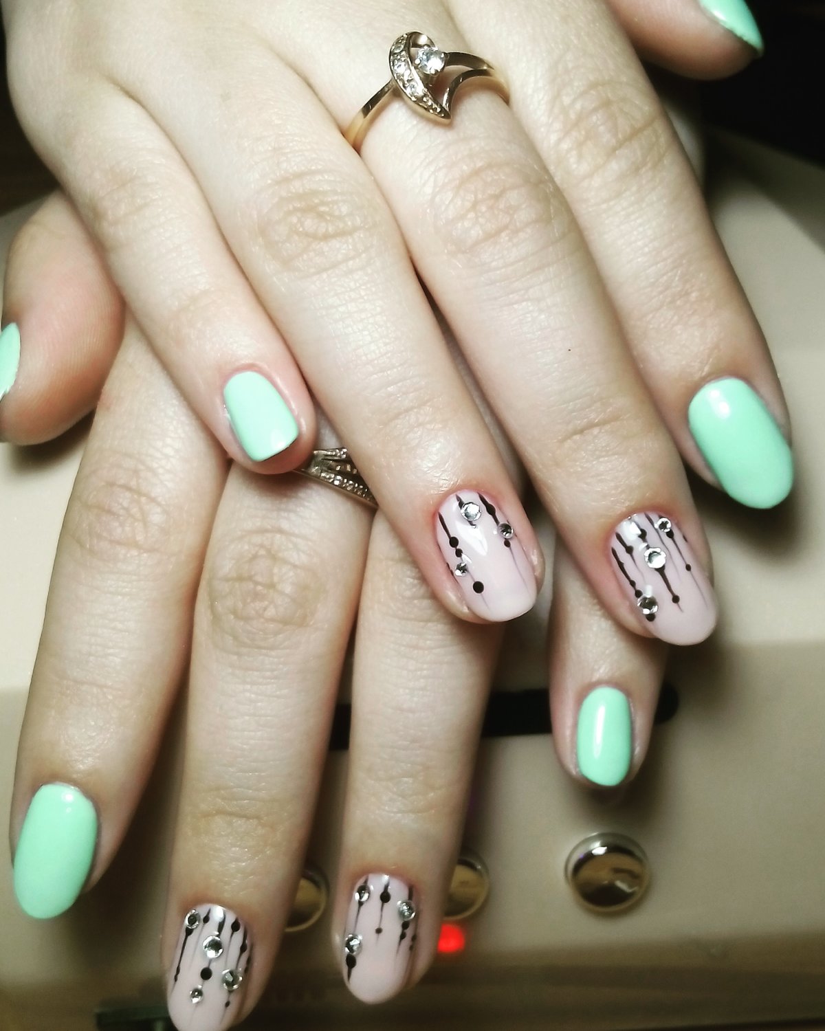 Drawing on the nail plate is one of the best ways to decorate accent nails. For this purpose, special devices are used, which can make images both volumetric and flat. One of the most popular prints of the new season were peas, stripes, and geometric shapes. At the same time there can be several contrasts on a mint basis. The main requirement for them is a harmonious combination not only with mint color, but also among themselves.