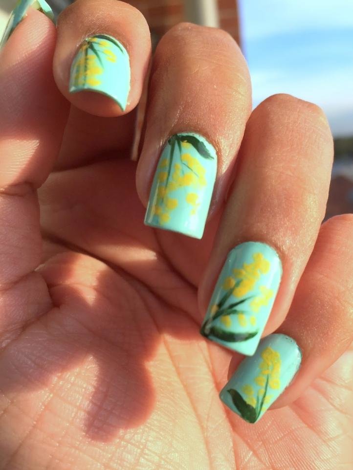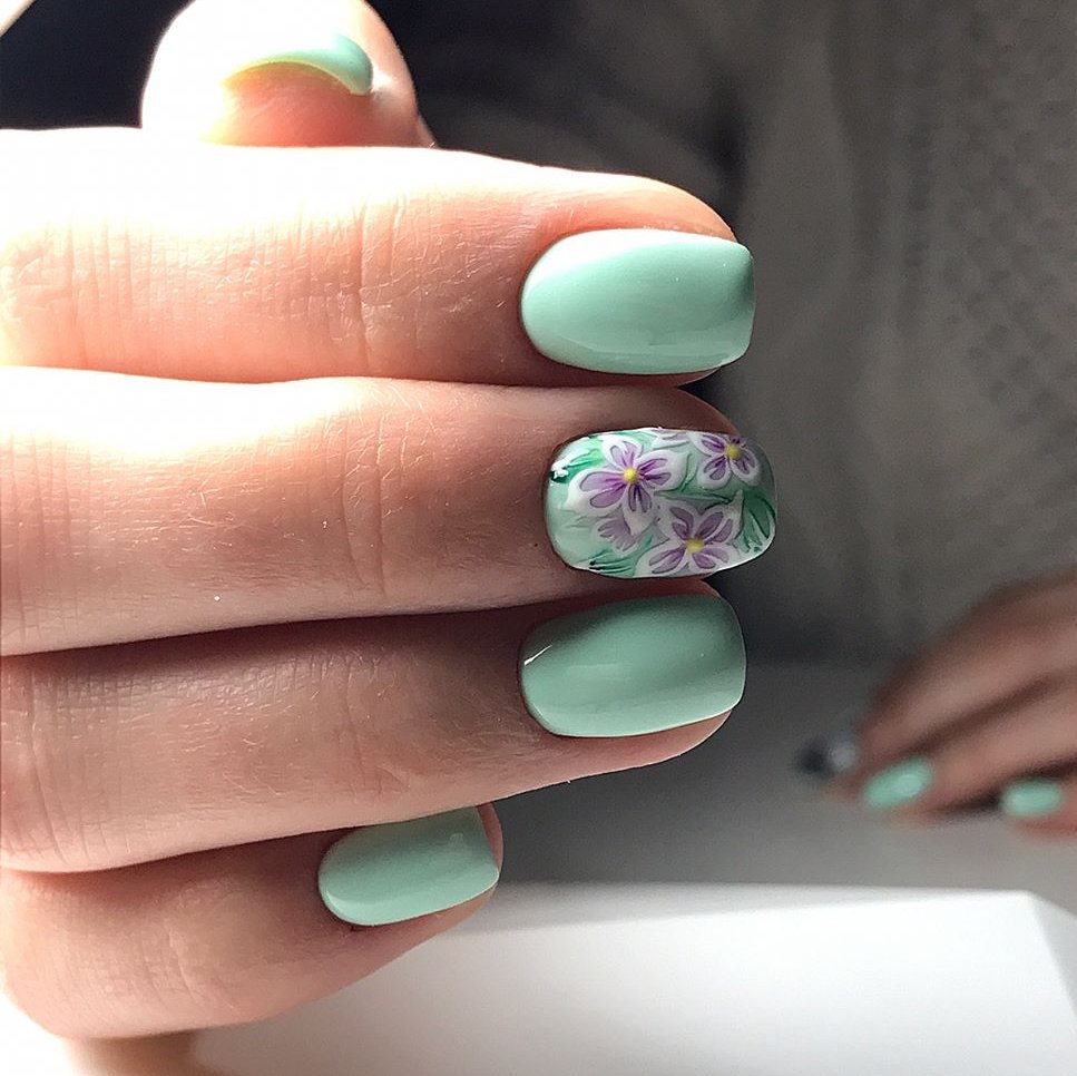In the center of attention are drawings with single colors, prints drawn in one color. If earlier a rather complicated picture on the nail was welcomed, today, on the contrary, lightness should be felt in the image. Well, if part of the nail plate with a mint background will be open. Gorgeous images that look harmoniously on a mint basis are lilies, dandelions, feathers, leaves, twigs, trees.