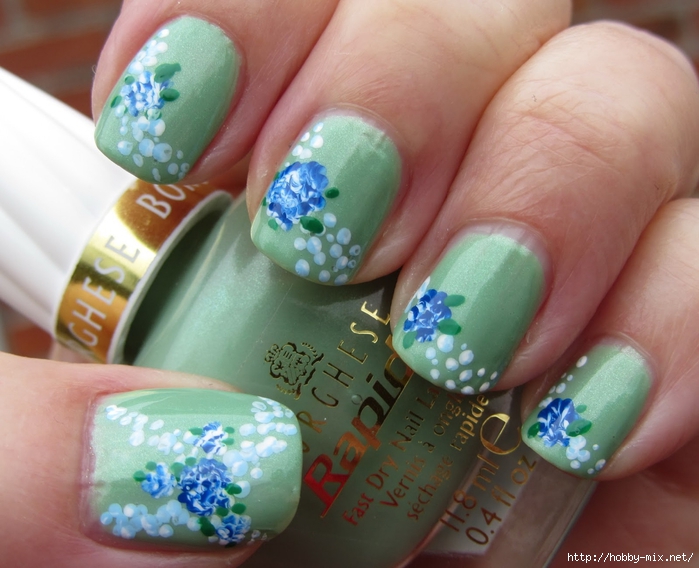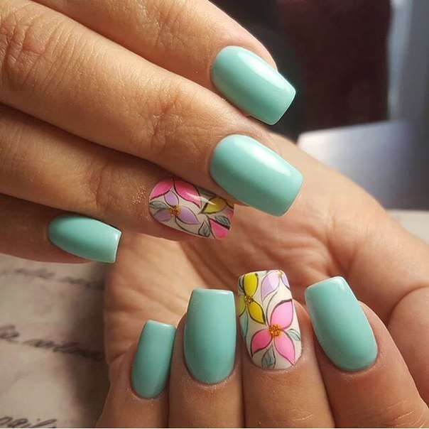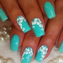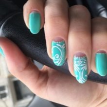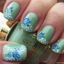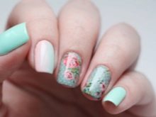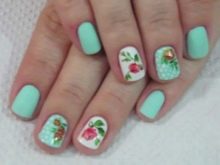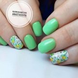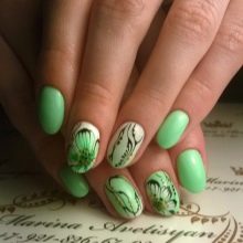 The gentle base of the mint color manicure needs the same delicate patterns. If they use contrasting colors, select color combinations should be particularly careful. For example, the same flowers will look more harmoniously, made in white and brown color, than painted with red pigment. As for the subject matter, it is diverse today. Fashionable to decorate mint manicure with pictures with the image:
