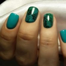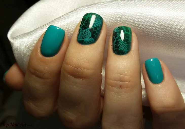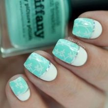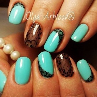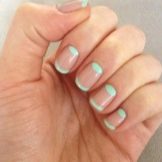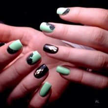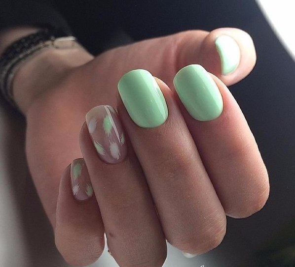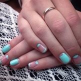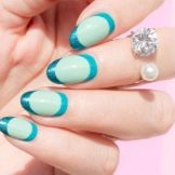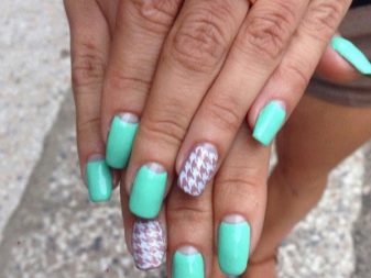 This manicure today is one of the three fashionable manicure techniques. Externally, it has the effect of nylon stockings, for which he received the second name "tights". In mint tones, this design looks especially gentle, while creating it is easier than ever. A transparent gel polish is mixed with a few drops of mint pigment, achieving a translucent texture. This coating is applied to the base layer, then dried and decorated with acrylic paint to match the pigmented varnish. Next, the nails are covered with a finish layer and dried under a special lamp.