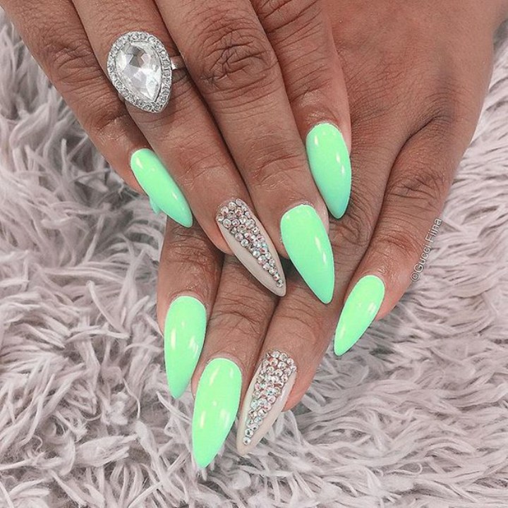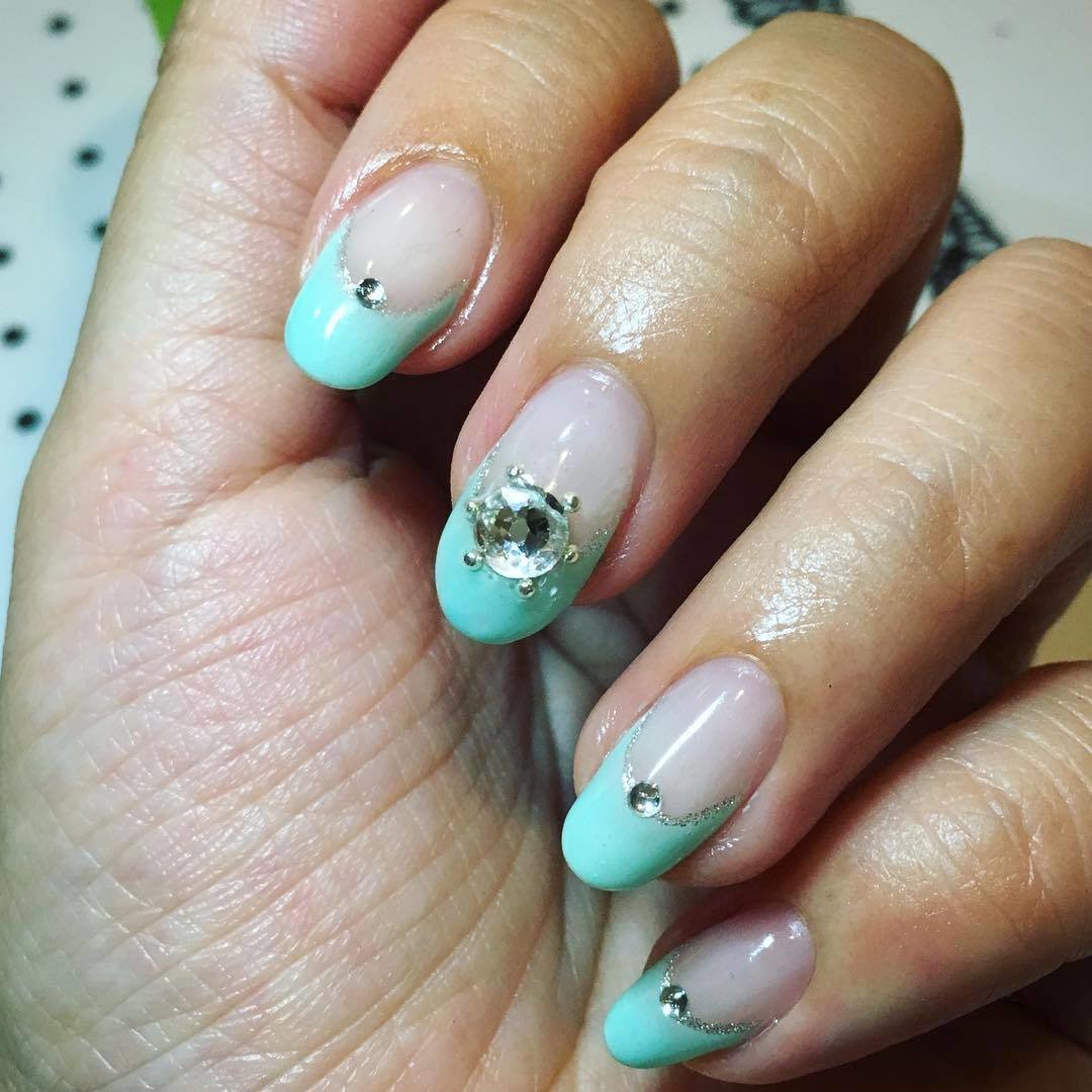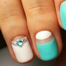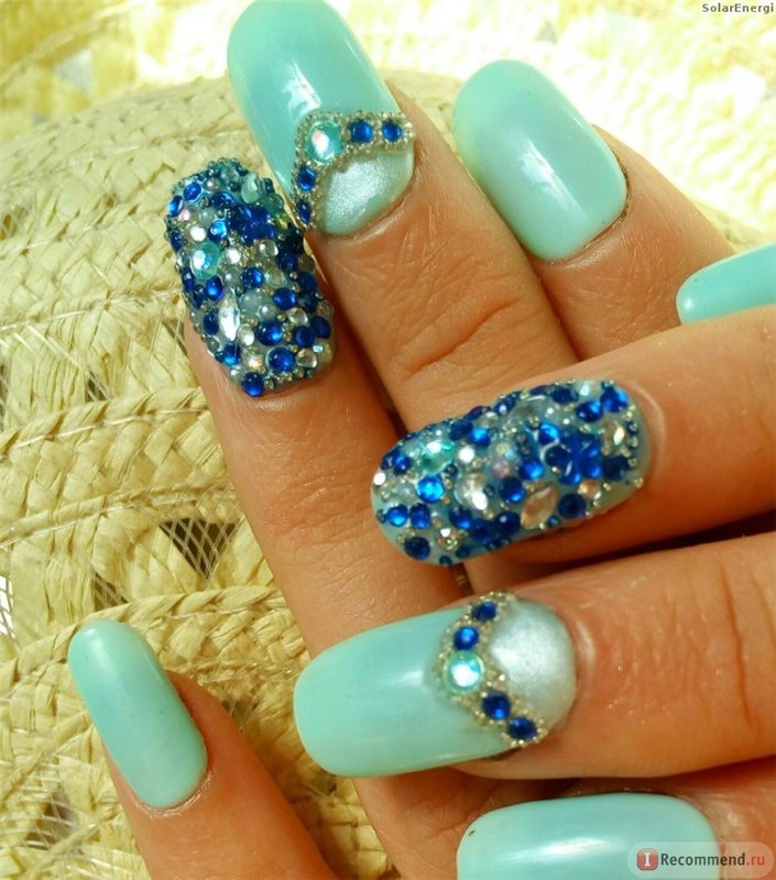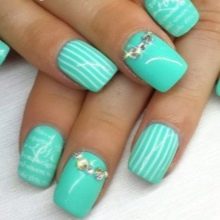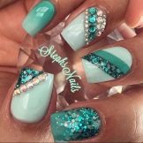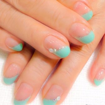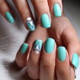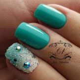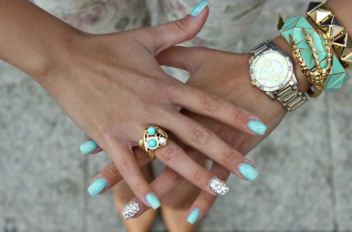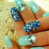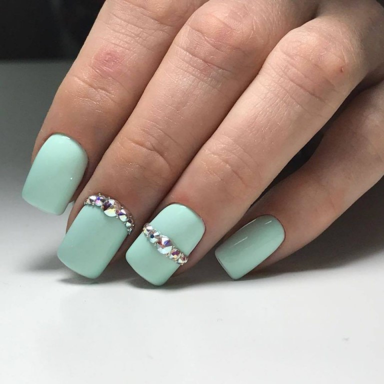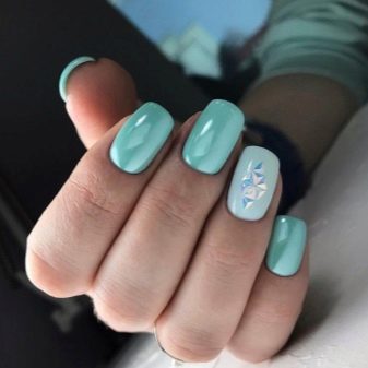 The sparkling elements used for mint manicure should take into account the specific case. For example, it does not always look harmonious in everyday looks, because instead of feminine beauty, it can emphasize bad taste. However, for a holiday or a special celebration this decor is quite appropriate. Moreover, it is possible to decorate the surface of menthol and light mint nails with crystals of different size and size.