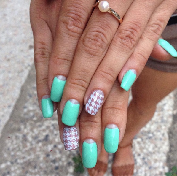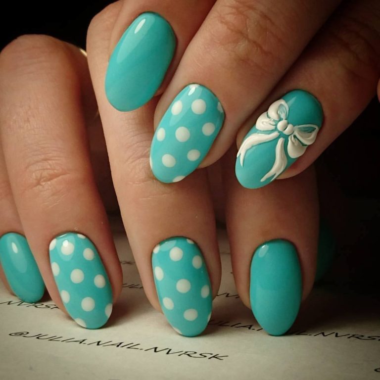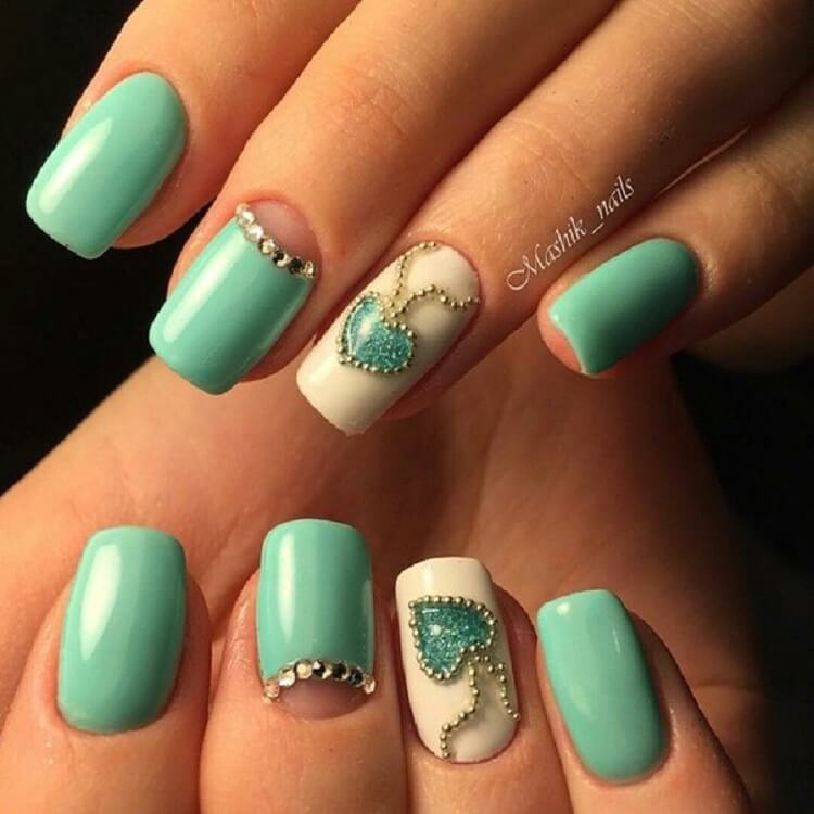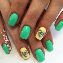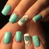 The mint manicure refines the feminine look, makes it a special fresh notes and with a competent design choice gives the luxury of a bow, complementing the feminine attire. Of course, it doesn’t suit every thing from the wardrobe, but this is quite possible by combining mint with other shades of color palette.
