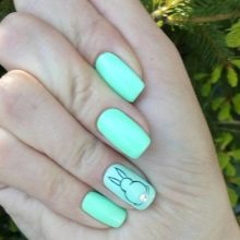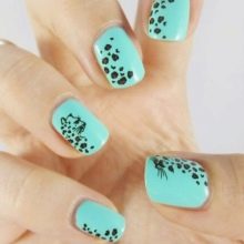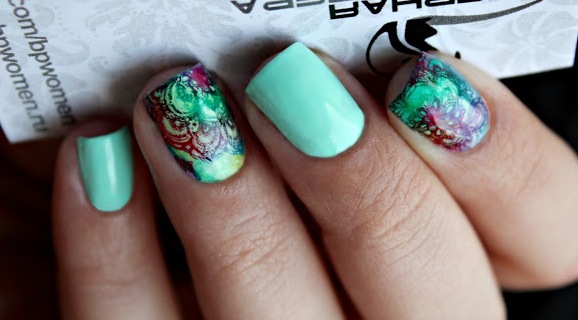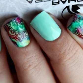 Finished pictures can rightly be called one of the best methods of decorating mint manicure. Both everyday and marshmallow designs can be used as a basis. Decals save a lot of time drawing the smallest elements. At the same time, they are able to give the appearance of a manicure sometimes not just beautiful, but stylish and fashionable. For example, you can decorate the surface of the nail pattern in sketching technique or a stylized image of a faceted animal.