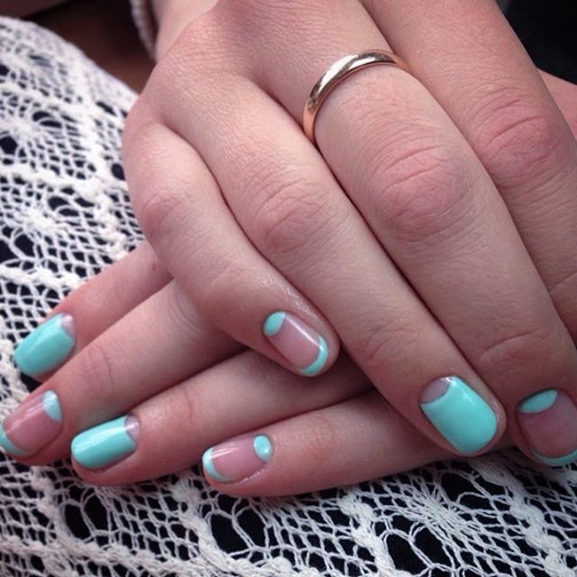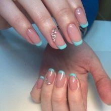 The method of service is based on the emphasis of the upper edge of the nail plate. French manicure done in two ways. At the first, the nail is stained according to the classical method, then a so-called “smile” is painted on top of it. When the service jacket does not have a colored base, it is performed on a transparent gel lacquer, displaying fine lines in a mint color. Since today there are asymmetric techniques and geometry in the trend, instead of the usual smile, the jacket can be indicated by a diagonal or a figure with a triangular shape inside.