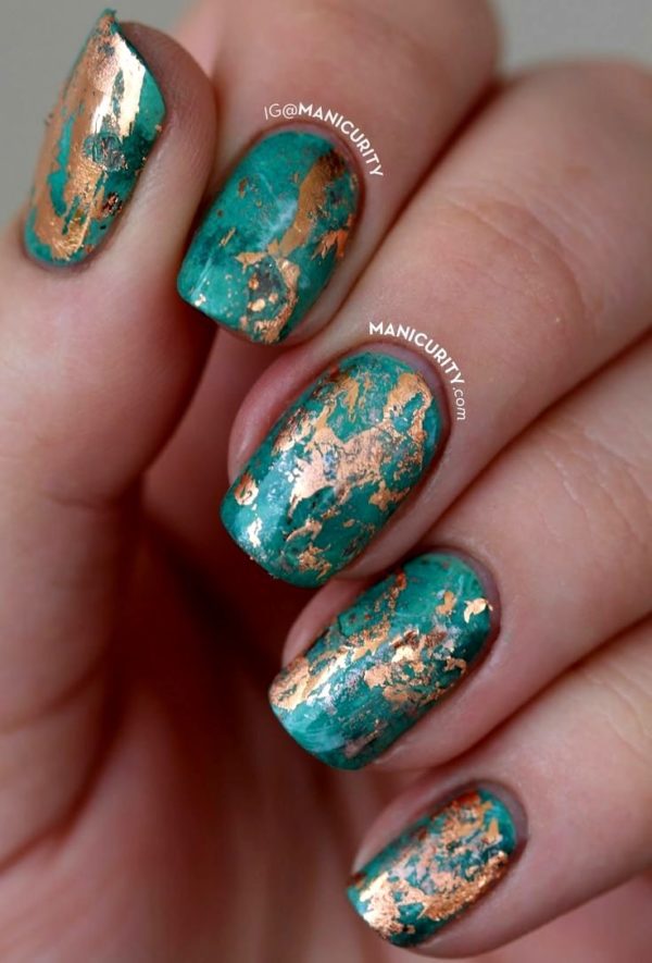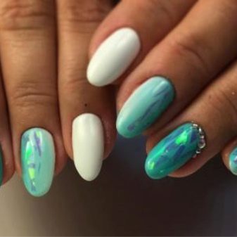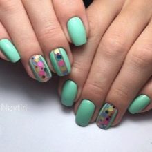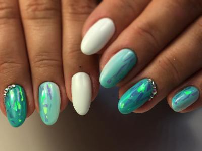 Today this technique is the most popular and spectacular. Such a manicure is always seen by a mass of enthusiastic views, it allocates a woman from the crowd. Create this design on the basis of a classic manicure. Nails are stained with pigmented mint color and applied top. Before drying, finely cut pieces of a special film, iridescent with a rainbow color, are fixed on the top. After decorating, a double layer of top is applied to the nails and dried. The look of the design is cosmic and trendy.