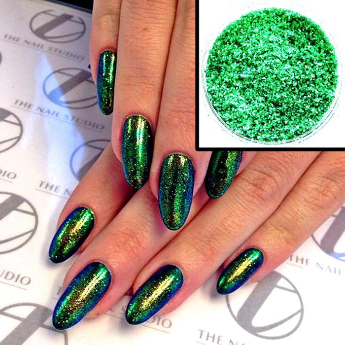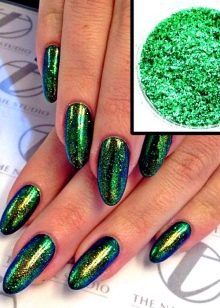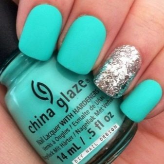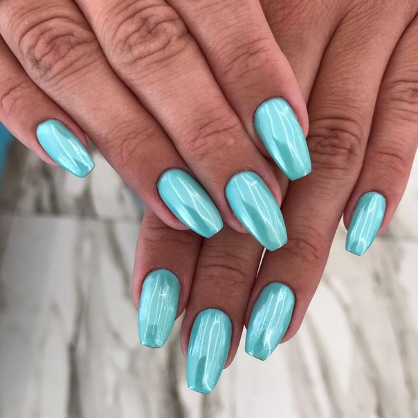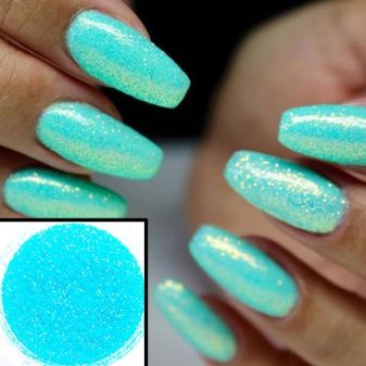 This substance allows you to change the texture of mint color, making it multifaceted. In this case, you can buy today options with different effects, due to which the coating will look not just stylish and unusual, but spectacular and expensive. Rub in on the pigment, selecting the desired type of substance with the desired effect. Due to it, the surface of the nail can be poured with different translucent shades, which gives the manicure elegance and uniqueness.