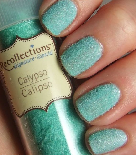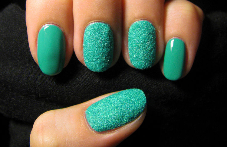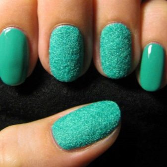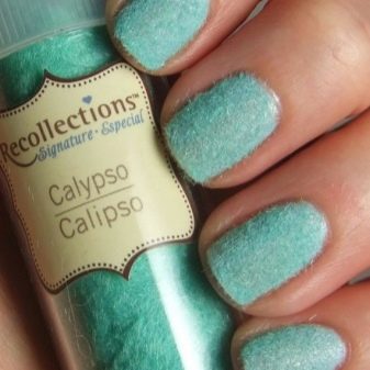 This technique allows you to get quite a spectacular and slightly volumetric texture of the coating. Someone calls her "manna," someone "velvety." This is due to the polymer powder, which cover the surface of the nail after it is treated with a layer of top material. The powder is called acrylic powder or flock powder. It is sold in specialized stores in a wide range. You can buy it in any shade of mint color.