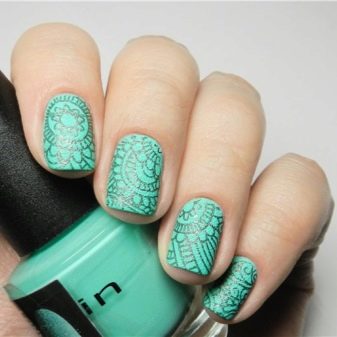 Special stamps significantly save time for drawings. As a rule, these blanks have certain motifs in different topics. It is easy to work with such a decor: stamps are transferred onto the nails with the help of a special sponge. The lines of the pattern are smooth and thin, due to which the manicure looks beautiful and professional.