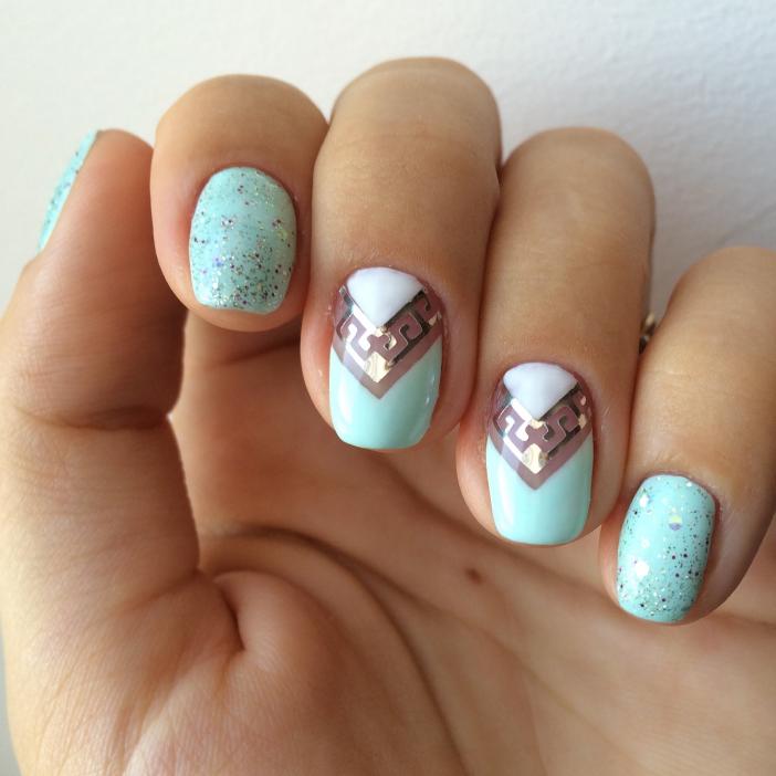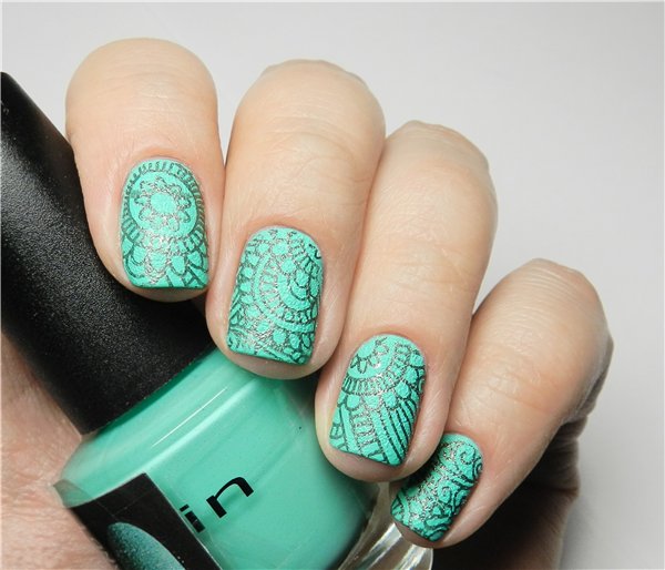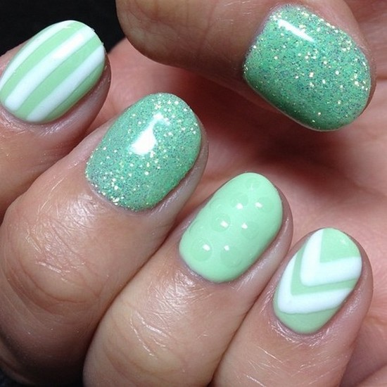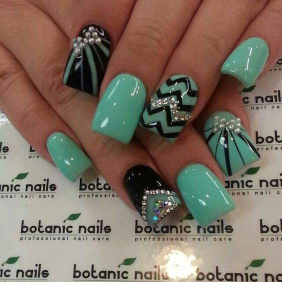 - Black stripes and silvering make a warm mint manicure stylish and effective.