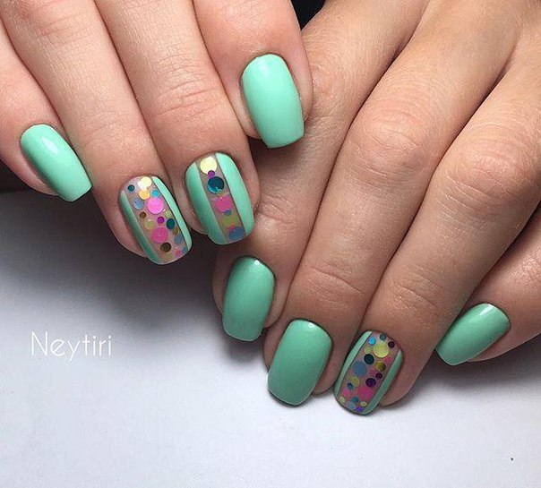 Such decoration is considered not only bright, but also fashionable. Today, the color and shape of kamifubuki is given special importance. For example, it is possible to decorate the surface of accent nails of small size kamifubuki in the form of hearts, asterisks or even geometric figures besides the usual circles. At the same time, the colors of the decor used should be combined with the mint base of the pigment.