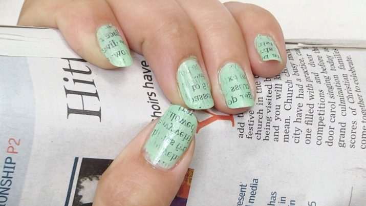 Such decoration today is at the peak of popularity. The newspaper is cut into small pieces, the size of which should correspond to the parameters of the nail plates with a margin. To get the desired imprint on the already painted accent nail, the newspaper is placed for a few seconds in alcohol, then tightly applied to the nail and kept for about a minute. To fix the pattern, on top of the prints put a finish and dry it.