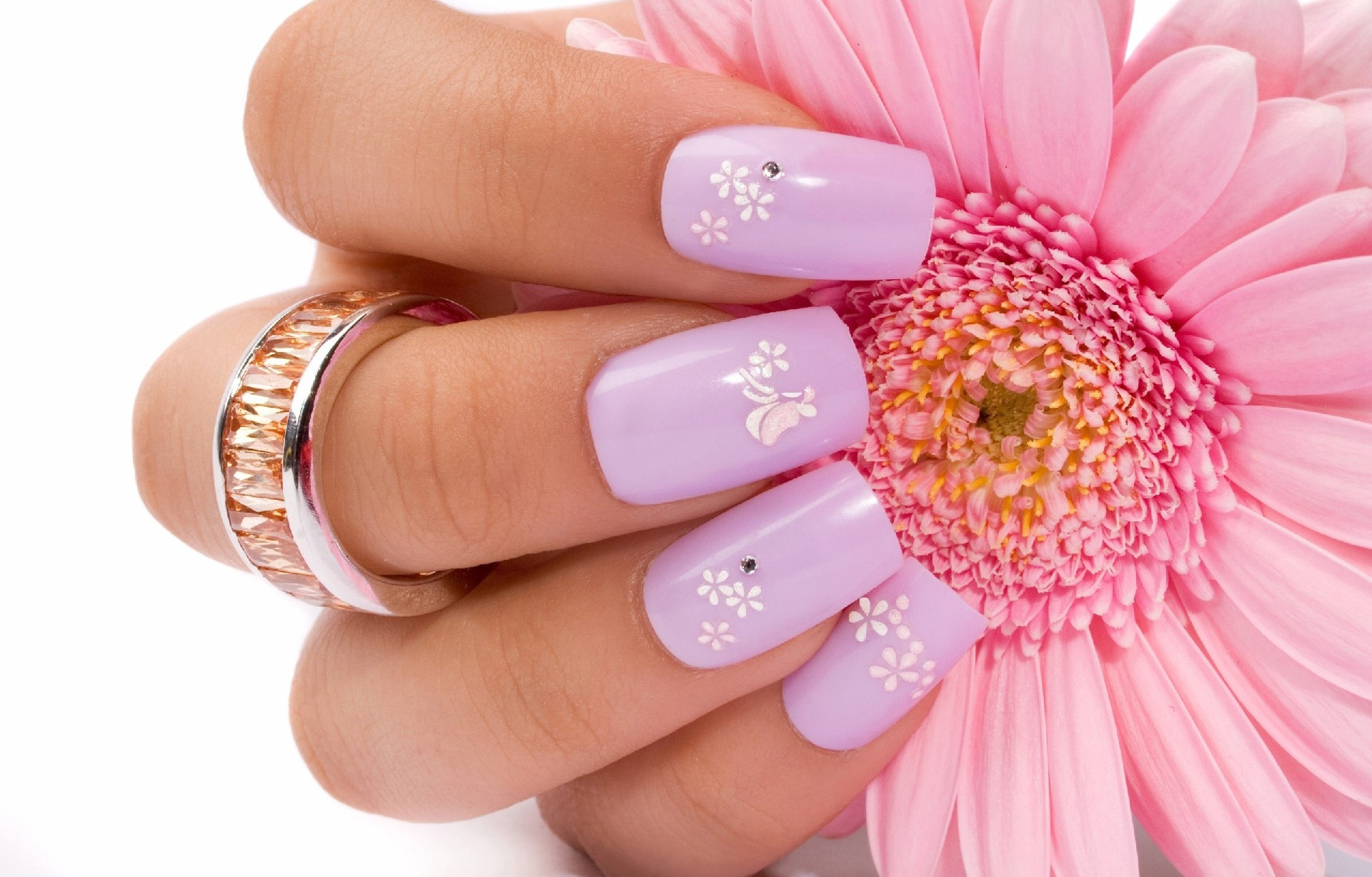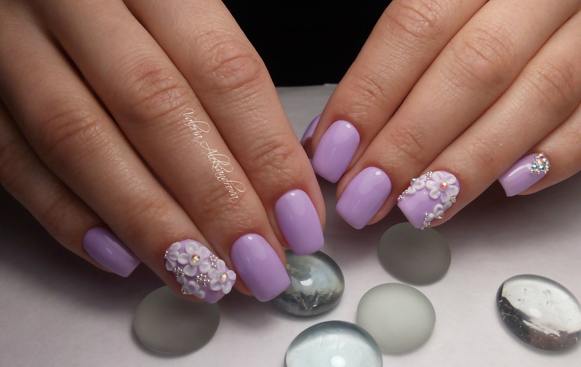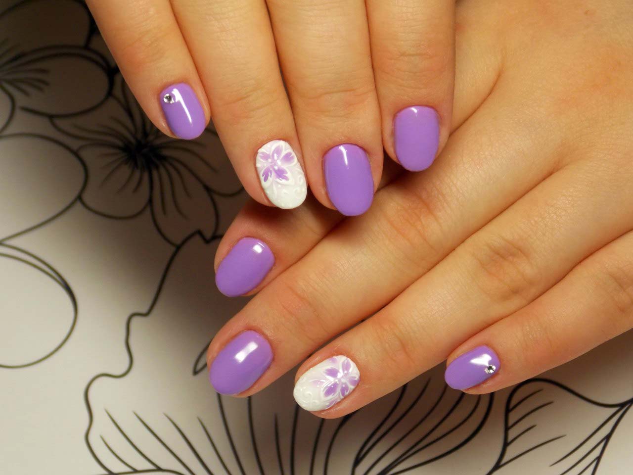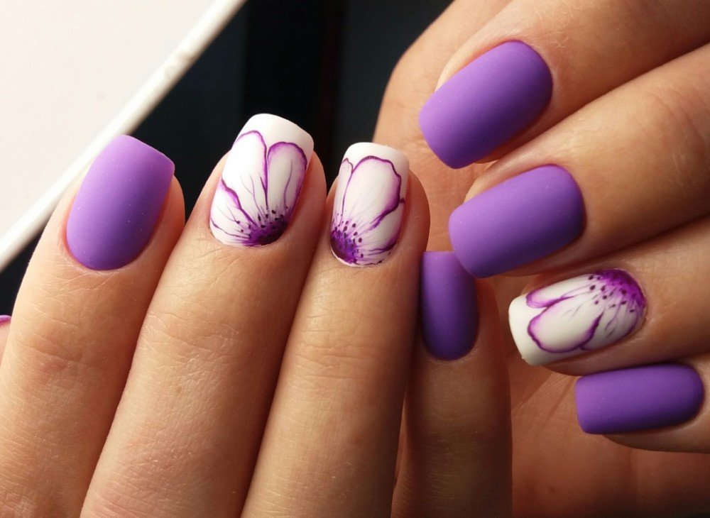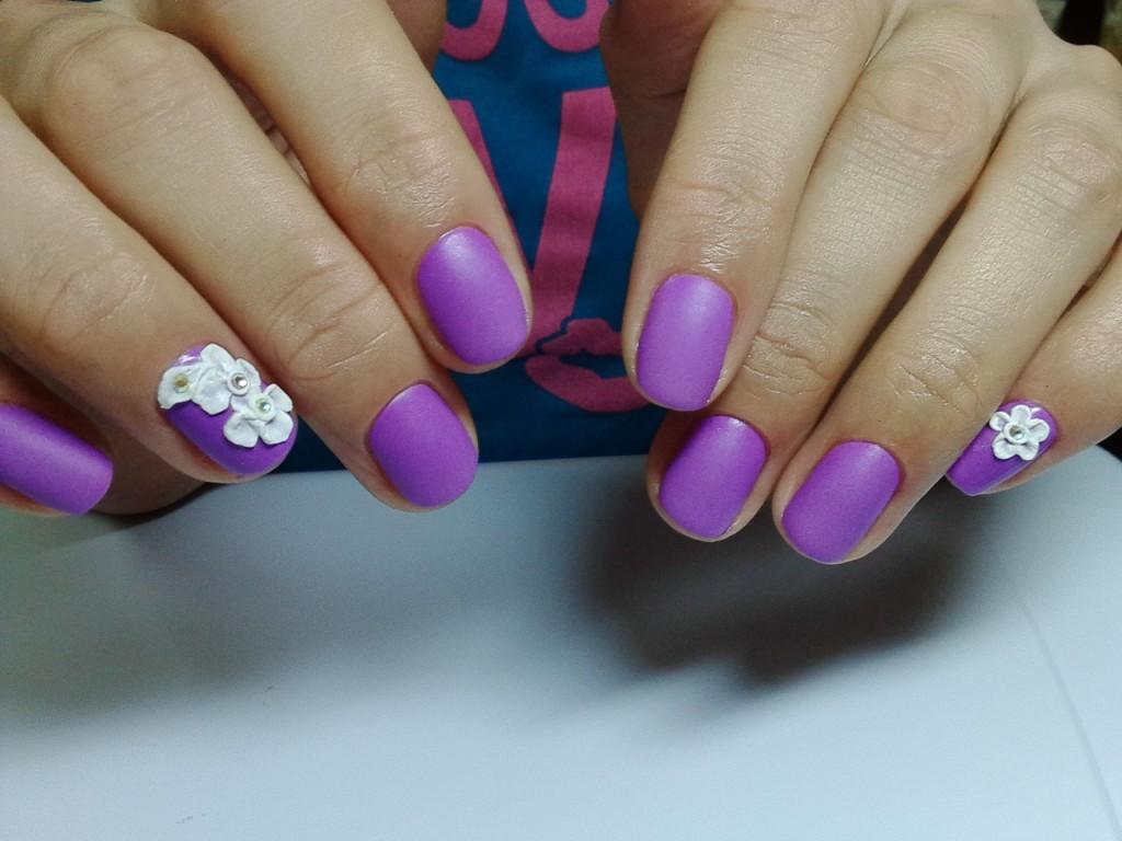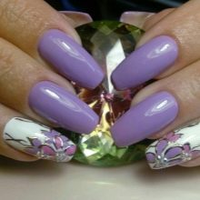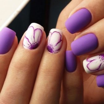 - Manicure using colors. Chamomiles, roses, dandelions, lilies, peonies - all this is the scope for drawings on the nails. Flowers can not only draw, but also use 3D modeling. The three primary colors used in combination with lilac are green, pink and white.