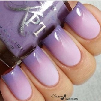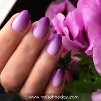 - Gradient. Most likely, the most popular and frequently requested manicure.It is interesting, attracts attention, unusual and uniquely looks on the nails. Lilac, lavender and violet shades are often combined with white, yellow, silver, gold colors. Such extensions create a special attractive accent in manicure.