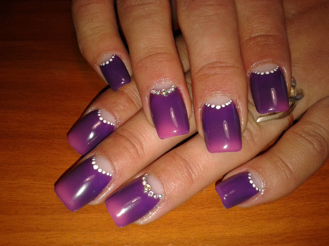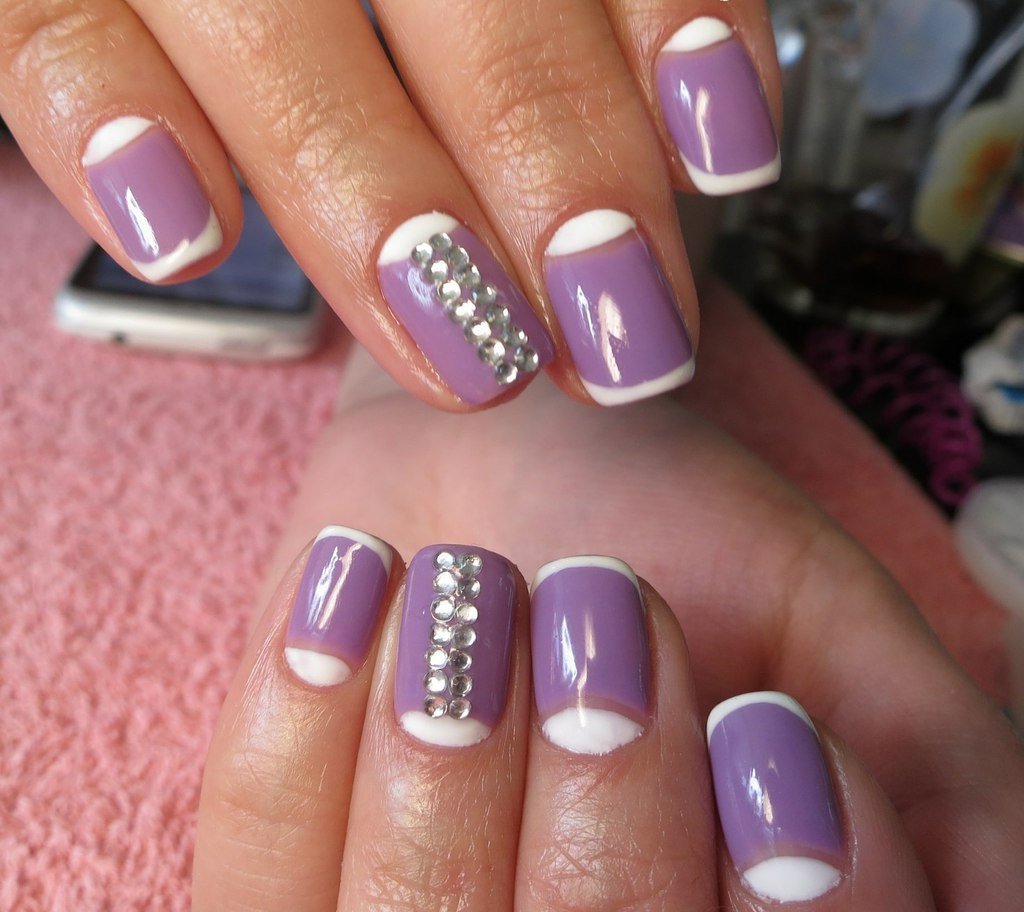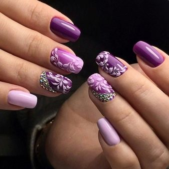 - Lunar. If you are familiar with the art of nail art, then you will not be difficult to imagine that lilac is the color that can be the base. Recently, lunar manicure is very common and is one of the most popular. In this technique, to create a more refined design, rhinestones are used, which shimmer in the light, adding zest.