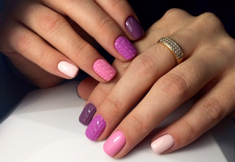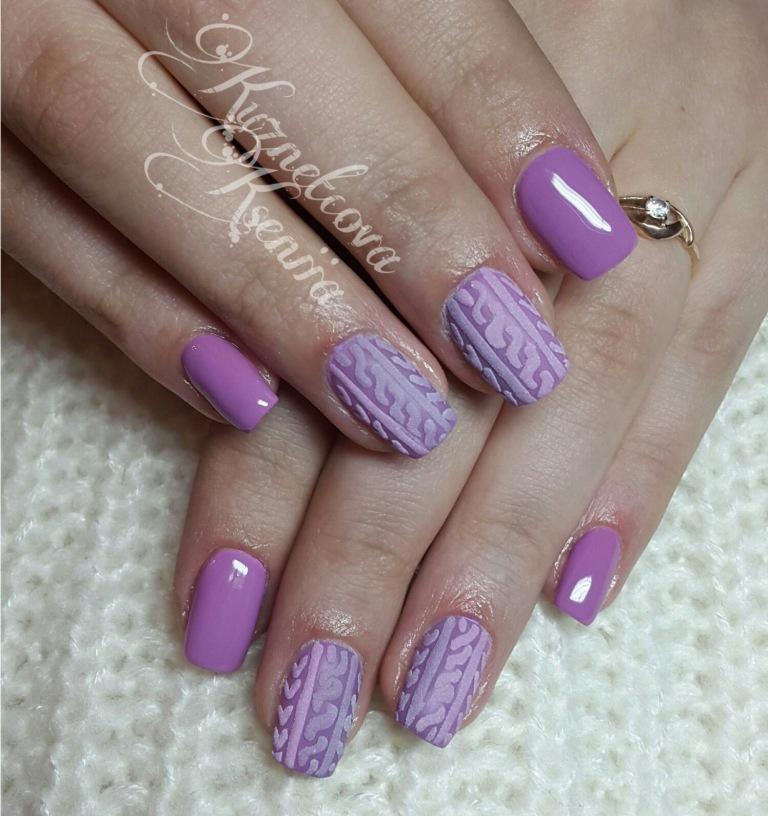 - Knitted. Such a manicure is obtained by sculpting on the nails, which mimics braids or volume knitting with needles. Such a design is preferred in the colder season, late fall or early winter. Since lavender is more inherent in heat, in winter it is not particularly in demand.