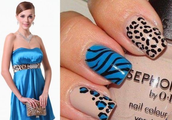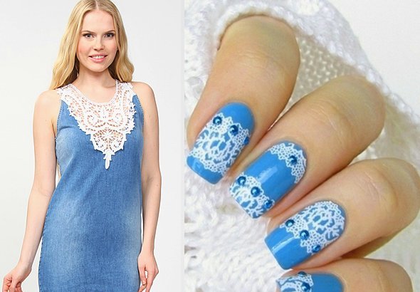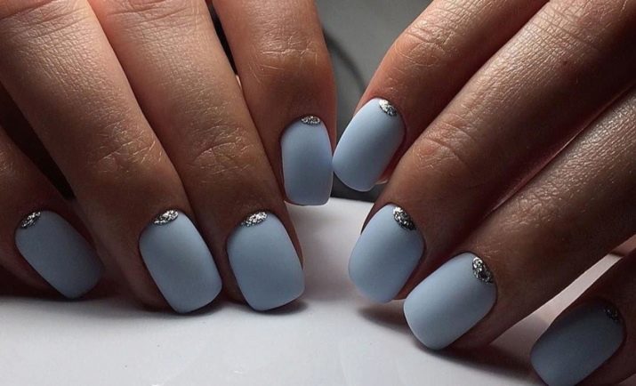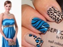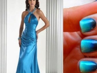 There are a large number of manicure options for a blue dress. In addition to varnish, you can add a variety of jewelry in the form of glitter, rhinestones, decorative strips or special figures provided for nail design. Modern fashion knows no boundaries in fantasy and allows for experiments with the image.
