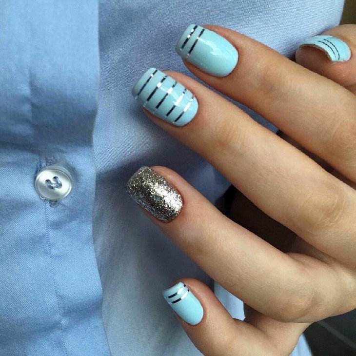 The blue shade perfectly combines with other colors. It is recommended to apply a darker tone on short nails, as it looks better. All shades of blue and blue will do, they can be painted solo or combined with each other. An excellent option would be white, beige and milky color, which will give the image of tenderness and fit to the accessories. A light blue dress is often complemented with pastel shades of pink, mint, purple or canary.