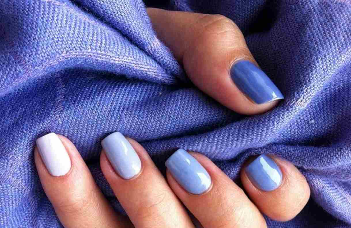 - Ombre. This manicure is very popular and will harmoniously look on the nails of any length. The first layer should be applied to a transparent base, so that the design lies flat. Next, a small piece of sponge is painted in the desired color and applied to the nail. The desired design itself will be transferred. The ombre can also be of another kind, the peculiarity of which is the transition from a darker to a light color not on one nail, but on different ones. For example, the little finger is painted in a rich blue tint, nameless - in a lighter tone, medium - in blue, index - in cornflower, and large - in white. This creates a transition effect that looks great with any outfit depending on the color chosen.