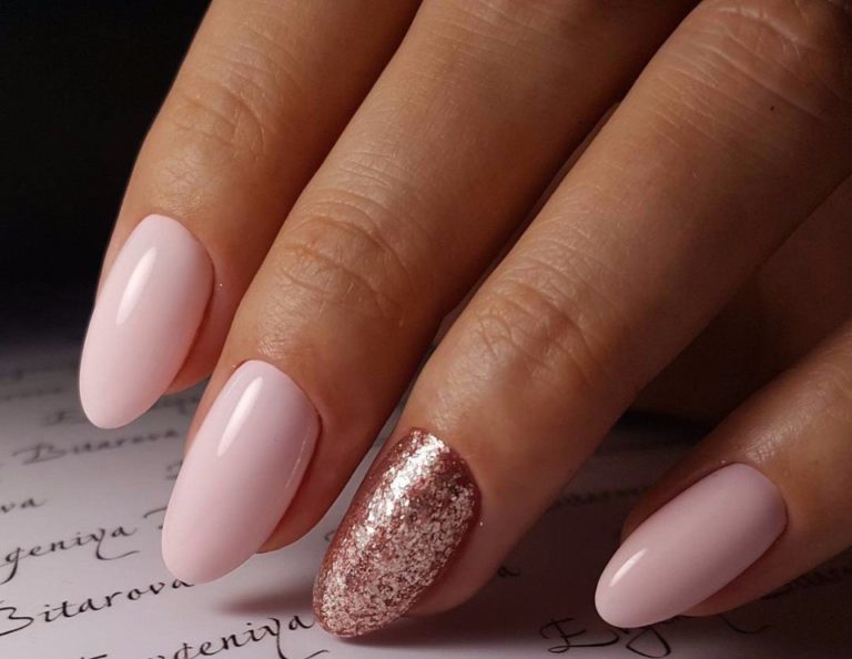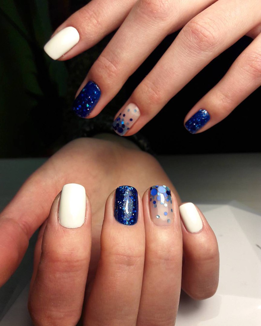 - Highlight. The peculiarity of this option is to select one or two fingers to choose from in a different color. For example, four nails can be painted in blue, and ringless - in white. The selection of the ring finger glitter looks very nice. Four pink nails and one with gold glitters perfectly complement the dress in cornflower blue. Another option would be a rich blue manicure with a white layer on the index finger and little finger.