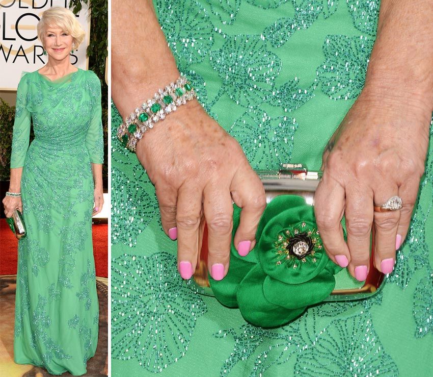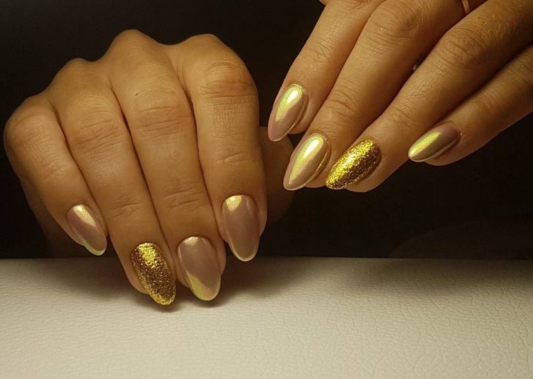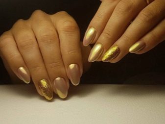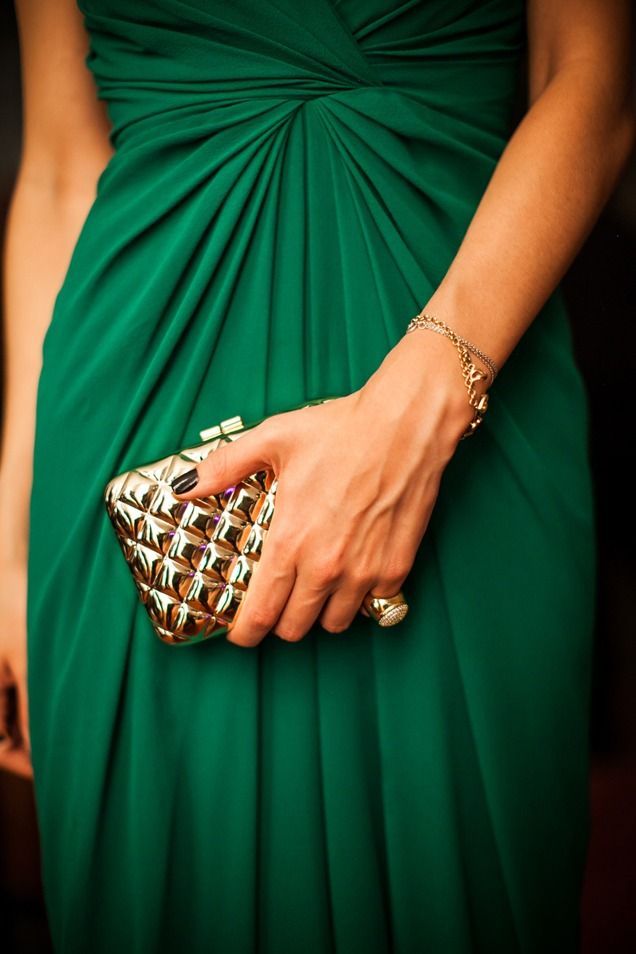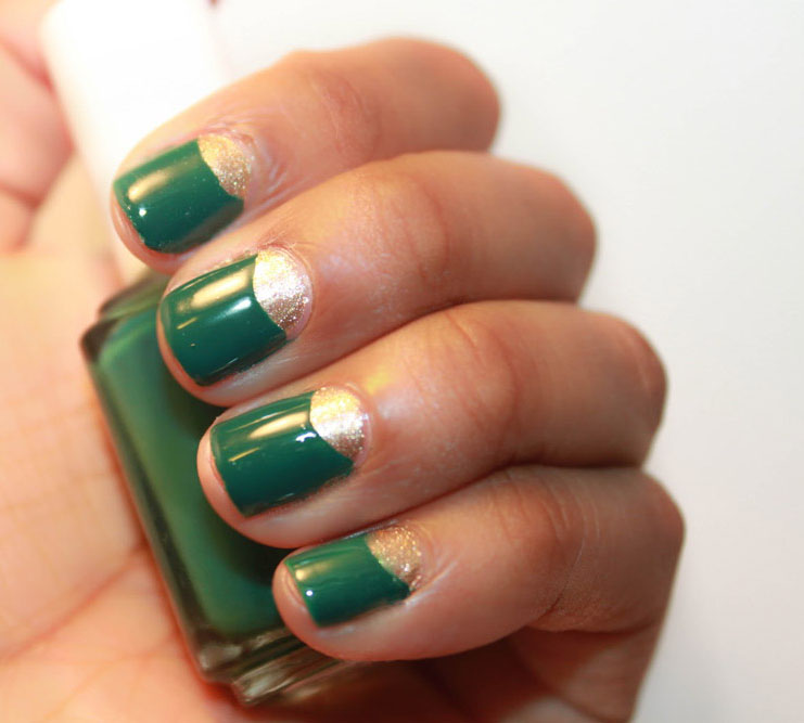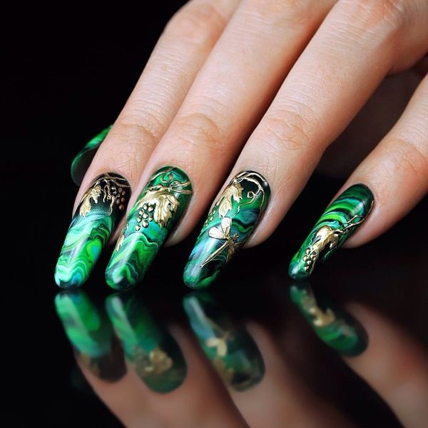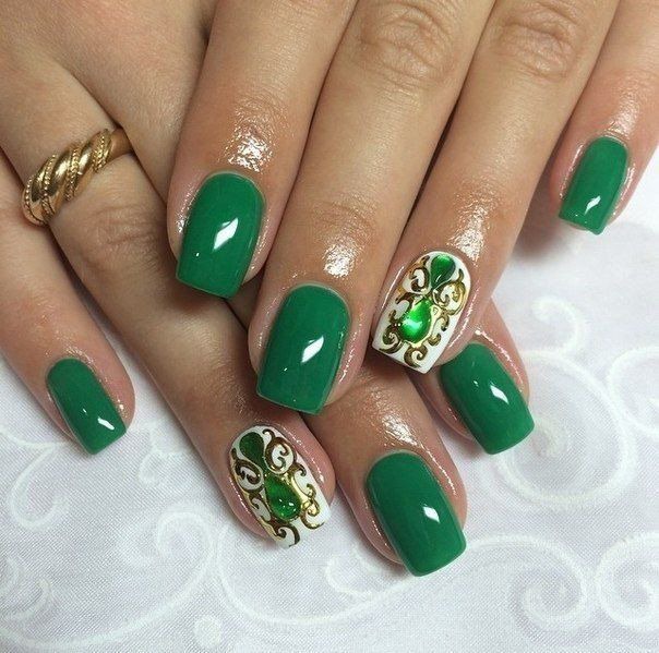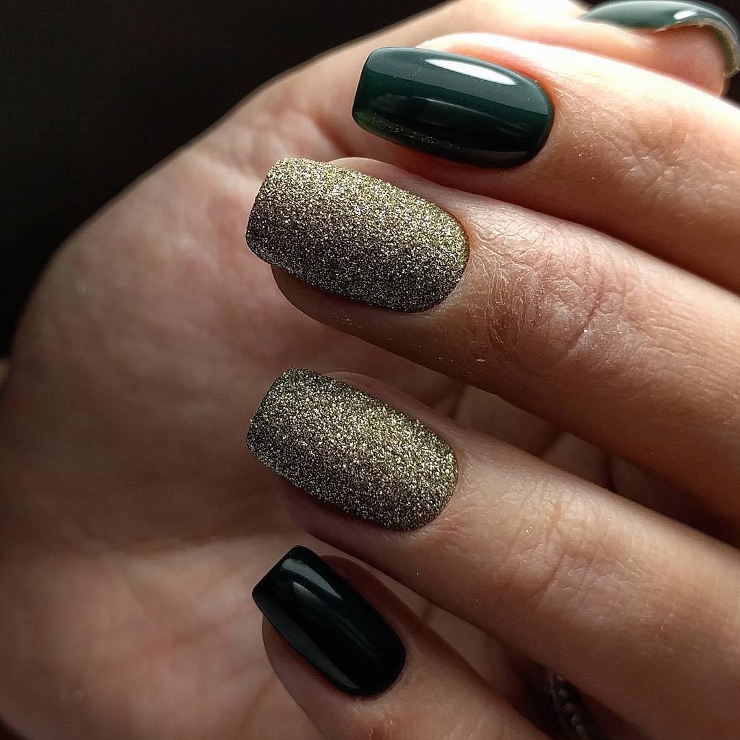 - Golden manicure goes well with green dresses. This option is a win-win, so it must be in service with every woman of fashion. Such detail in the image will give its owner grace and special chic. All around will know how excellent taste this woman has.