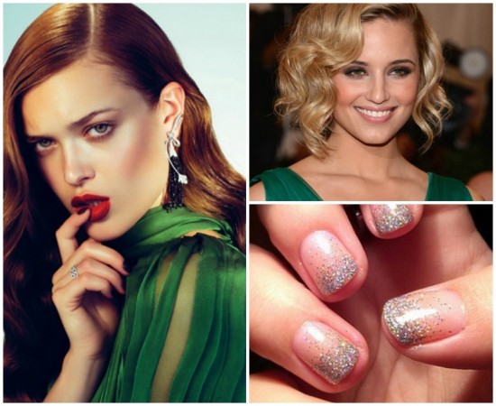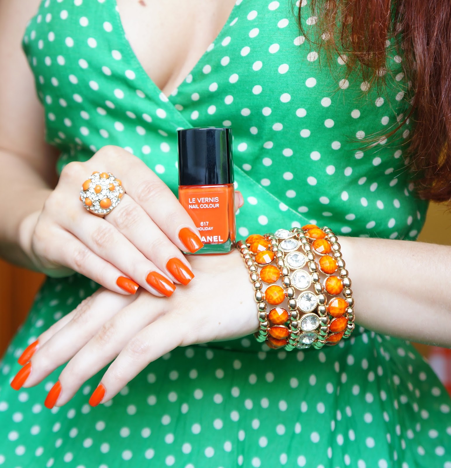 - To create a youth image, choose orange or red. The combination of a green dress and such a bright manicure will look fresh, the bow will turn out to be unobtrusive and stylish, but in no way provocative.