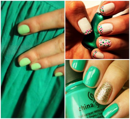 - Green with a bluish or bluish tint in dresses that are well suited for a brunette, will be in harmony with the turquoise on the nails, emerald, nephrite, cyan (sea wave). Lacquer with a touch of Tiffany can also be used in manicure, which is chosen for such an unusual dress.