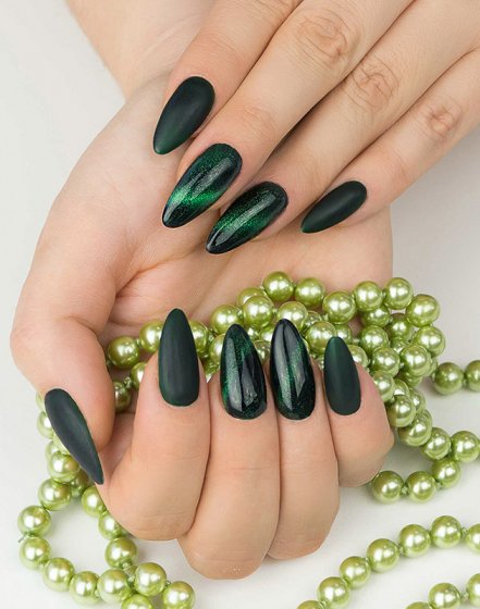 - Emerald dress is a special outfit that does not need additions and accents. It serves as an independent way. Each additional element of the image should correspond to such a combination; manicure is no exception. It should be concise and discreetly chic. The effect of "cat's eye" well saves in such situations.