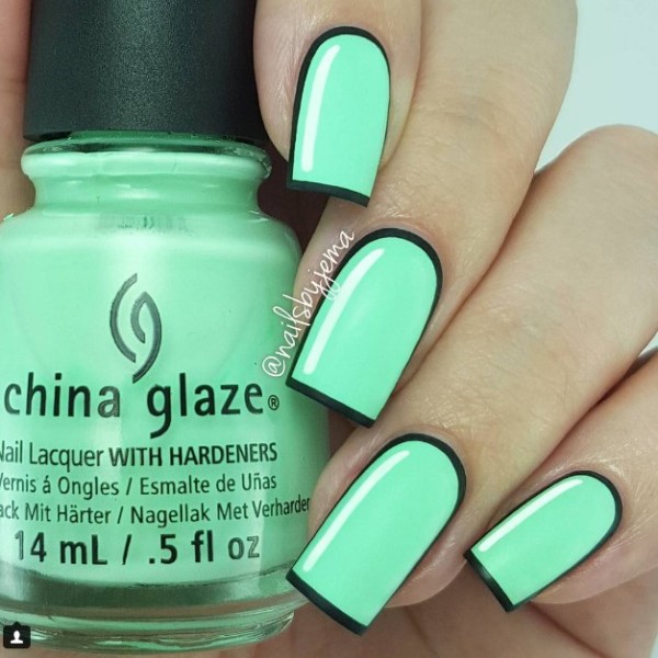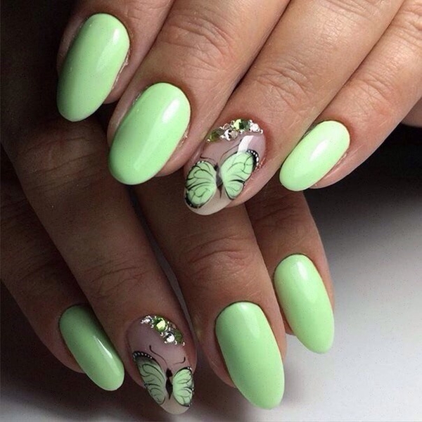 - If the outfit has a complex green tint, with elements of yellow, then the nails should show off a bright and rich lacquer. It can be lime or fresh grass, lime or pistachio. You can take a bold step and apply neon green lacquer to the plates, which will make the image more youthful. Also to this unusual along well fit mint coating.