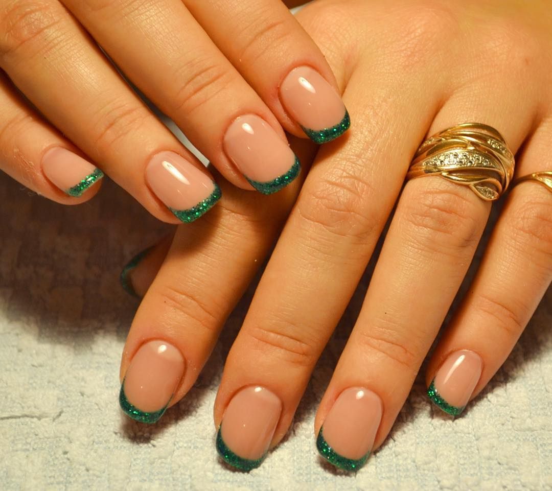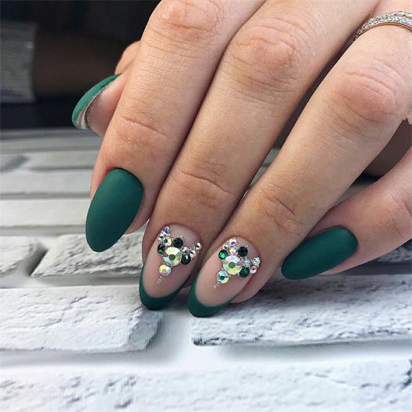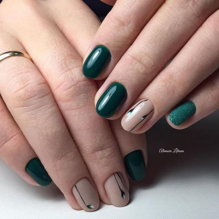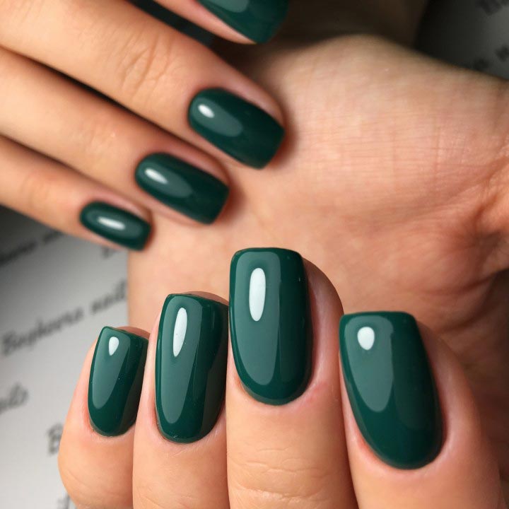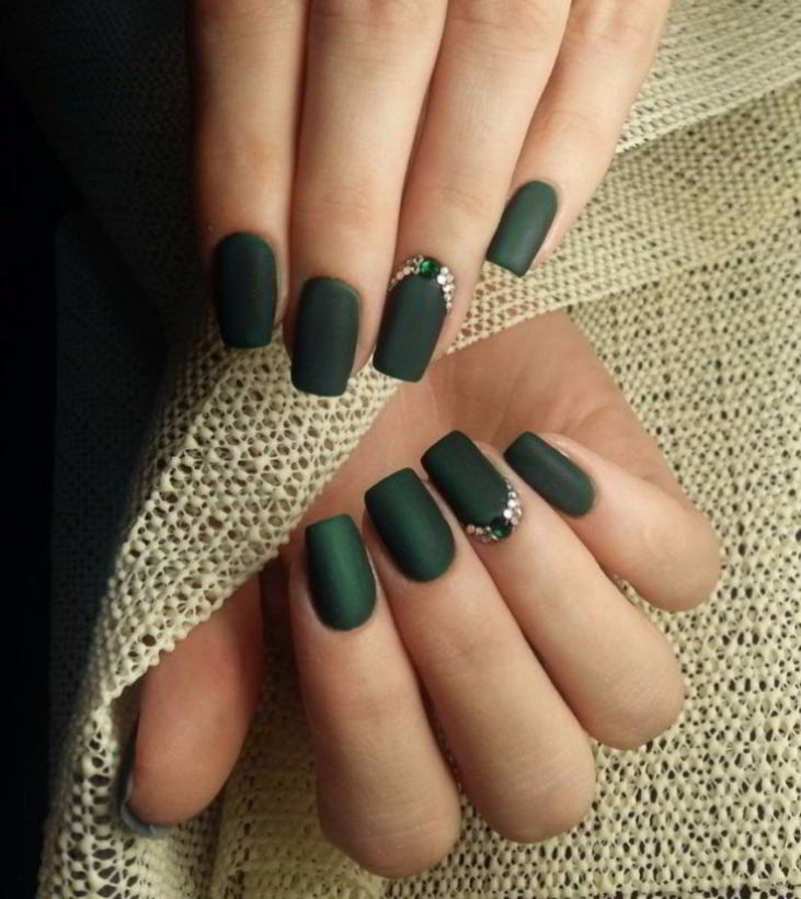 - Dark green dress allows you to combine a glossy and matte finish, green shades with beige. For summer outfits you can make a "watermelon" manicure.