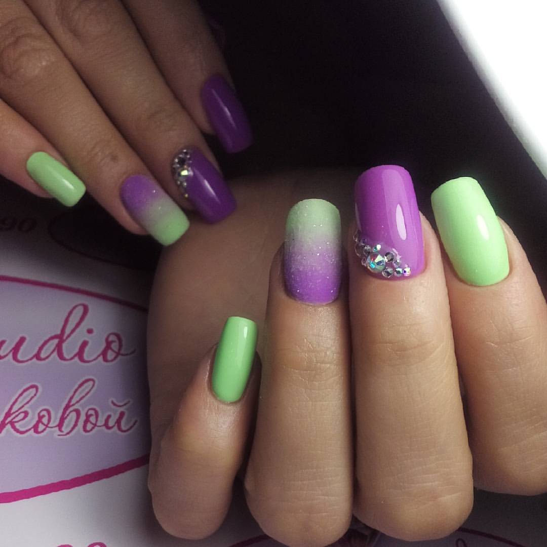- Salad dress always looks bright, it is possible to select a no less bright nail design to it. In addition to yellow, which was already mentioned in the conversation, you can paint the nail plate in light green and purple colors using the ombre technique.