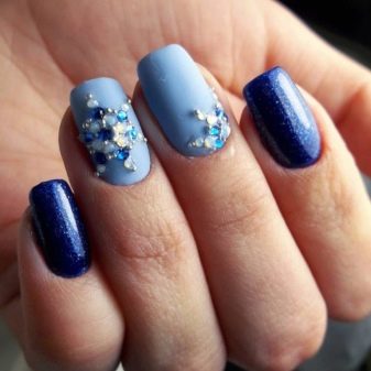 Nail design in blue tones is equally suitable for both delicate romantic ladies and bright girls with contrasting appearance. And blondes with blue eyes, and brunettes with brown will look organic with a similar color palette. Jewelry in this case is to choose from silver or white gold, as cold colors are better combined with blue hues. Such a manicure perfectly combines with topazes or blue sapphires.