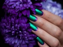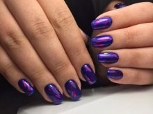 Looks great on long nails so-called rub, which allows you to create a unique effect of the game of rainbow shades on a lilac background. Both vertical and diagonal, and transverse patterns, as well as a complete coloring of the nail plate will be harmonious here. The only thing to consider is the dosage of accents. For the rest, there are no color limitations for long nails.