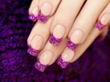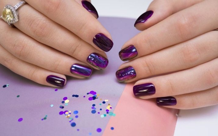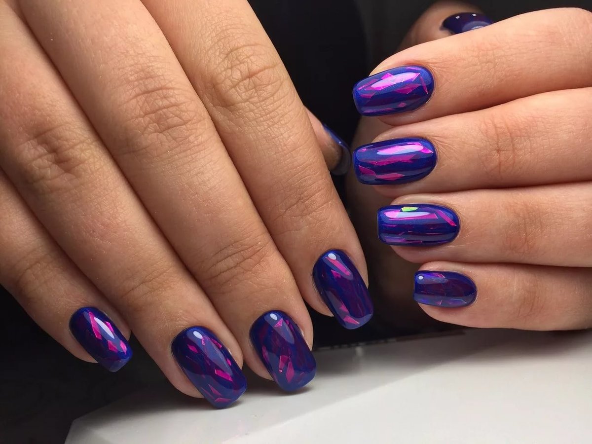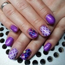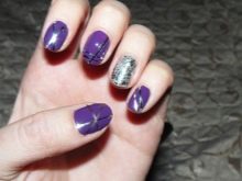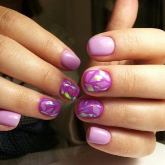 - Broken glass. Today, this design is the most fashionable of all the others. It is created with the help of a special film, from which the protective coating is removed, then cut and glued onto the pigment-covered nail. On a bright lilac background, in a moment, rainbows of tiny glasses appear. This nail design looks spectacular and stylish, it attracts rave looks.