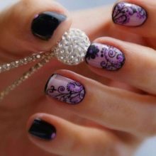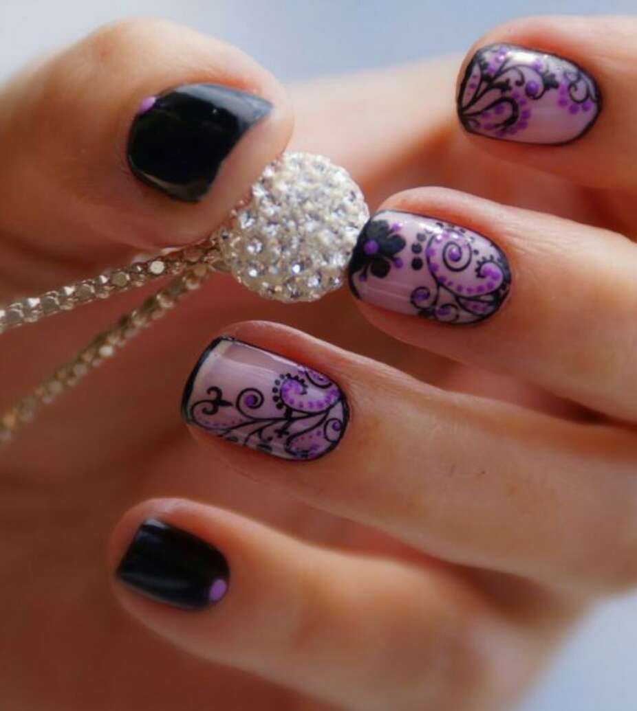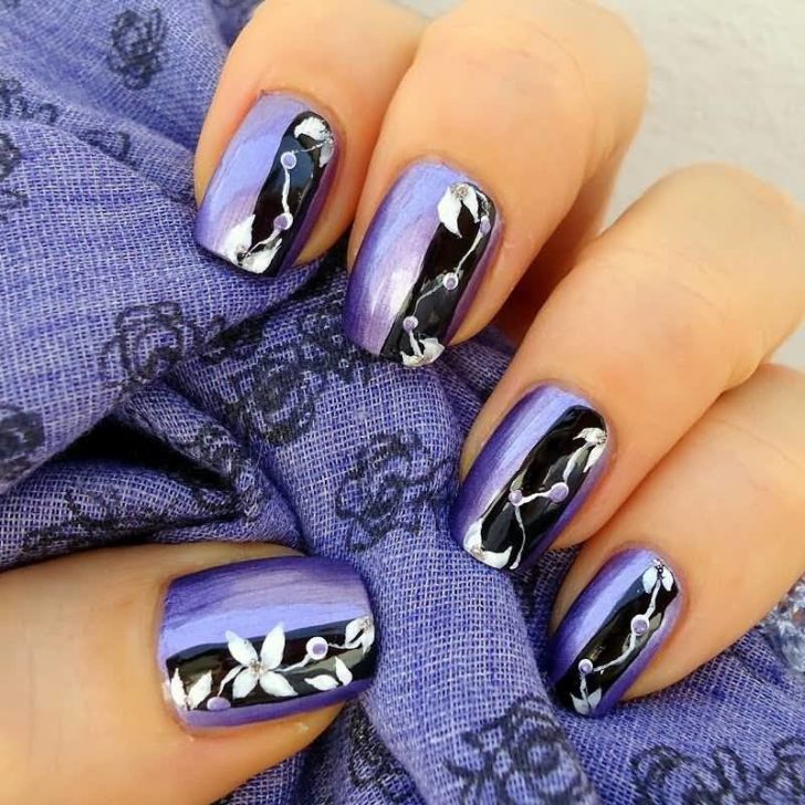 - Mirror lilac manicure with black contrast. Simple white floral pattern harmoniously combines two different emotional colors.