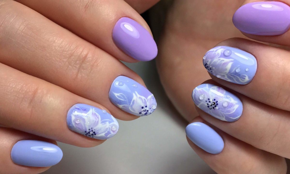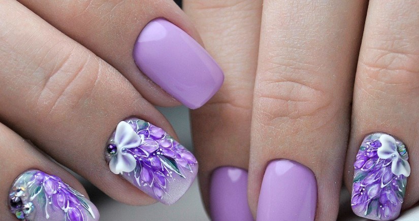 - Summer lilac manicure with accent nails in a floral theme.