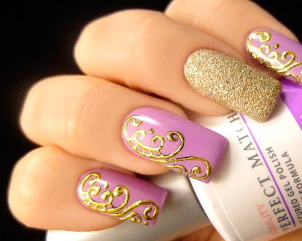 - Drawings. Drawing on the nails - one of the main principles of decoration today.Masters learned to do it so professionally that the drawings look just amazing. The theme for lilac at the same time can be very diverse: from flowers and plants to feathers, leaves and abstract divorces.