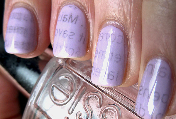 - Newspaper. This technique is based on the classic staining of the nail plates, after which they create prints using pieces of unwanted newspapers. To do this, put the newspaper in alcohol for a couple of seconds and then tightly pressed to the accent nails. After 30-40 seconds, the newspaper is removed from the nails and covered with marigolds with a printed finish. If desired, newspaper manicure can be decorated with other decor, which will give it a hint of vintage.