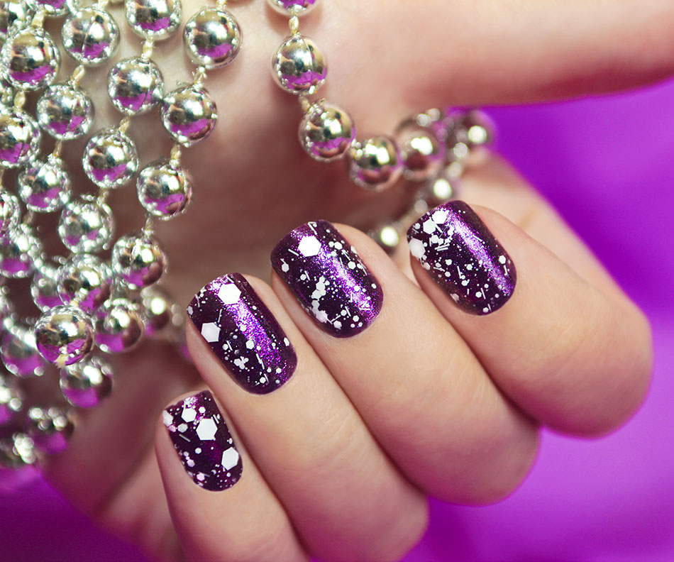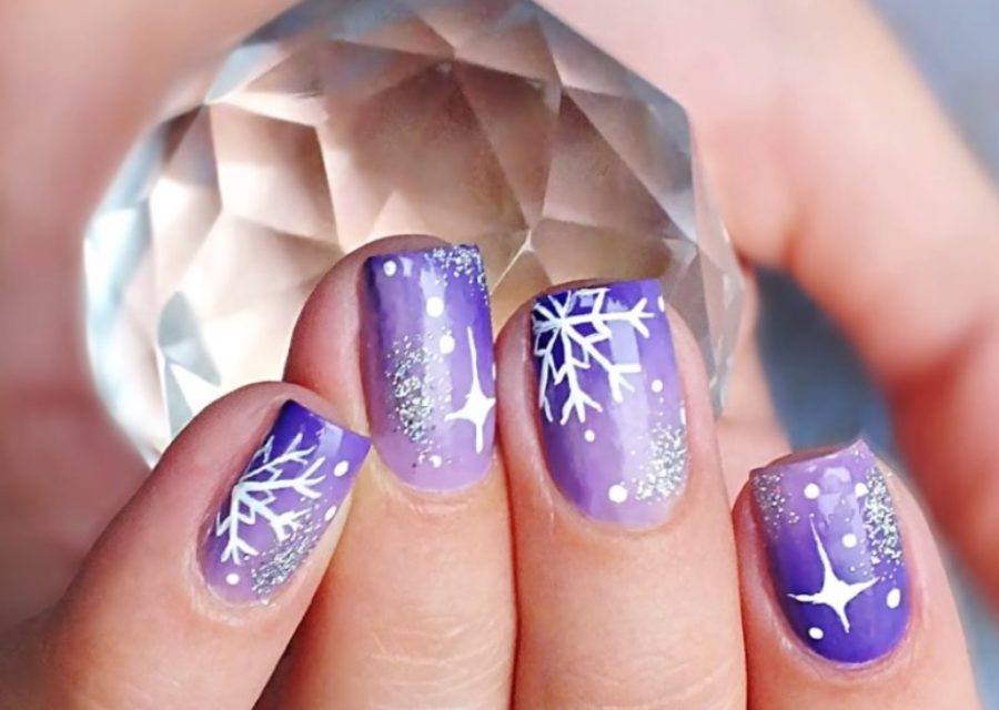 - Snow seasonal manicure with the correct placement of rhinestones.