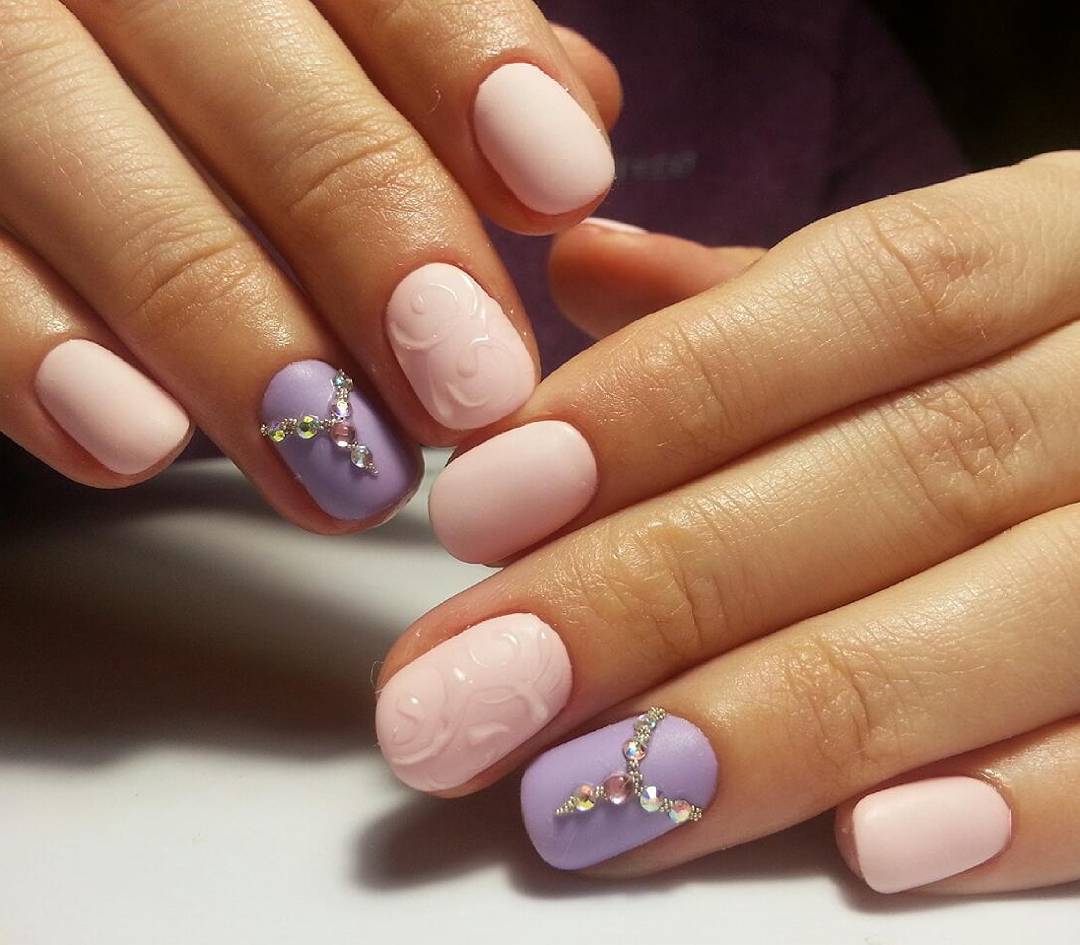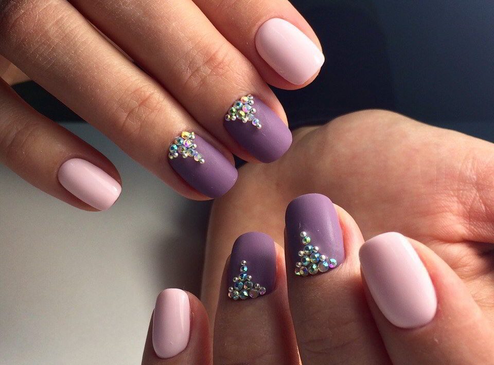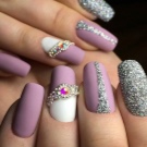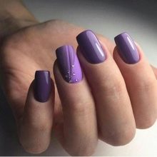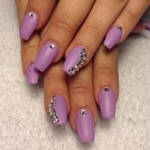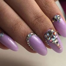 To create a spectacular and elegant manicure, you can use stones of various shapes, colors and sizes. Lilac manicure with rhinestones remains relevant from season to season. Sparkling stones can be successfully combined with various decorations or used as an alternative to jewelry.