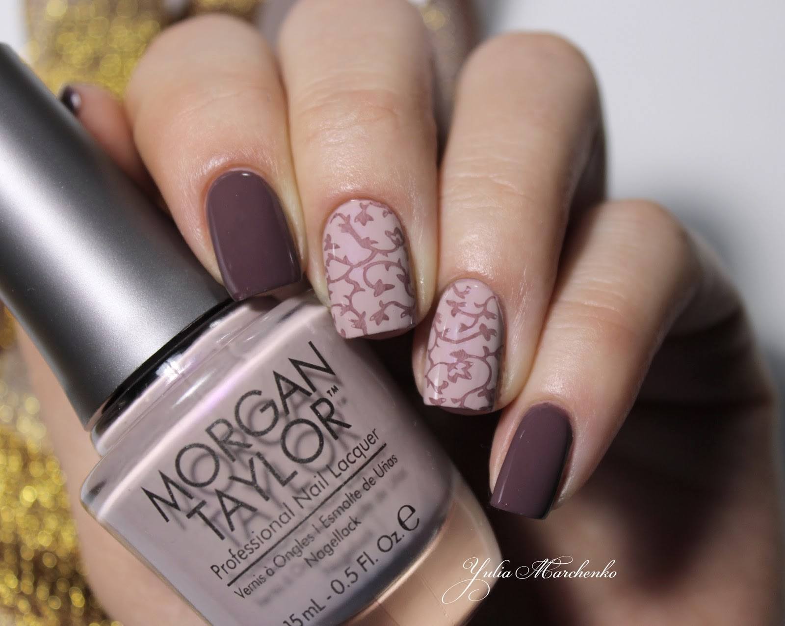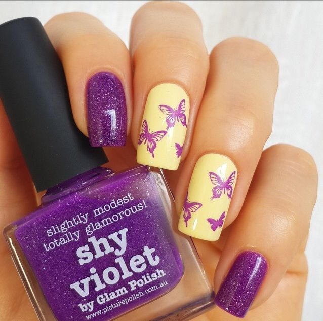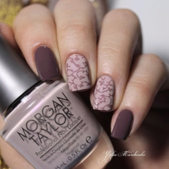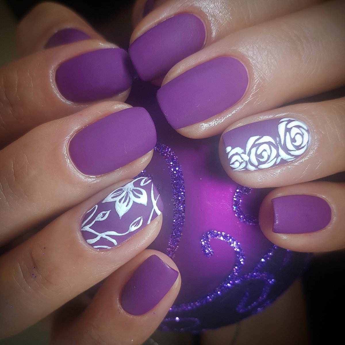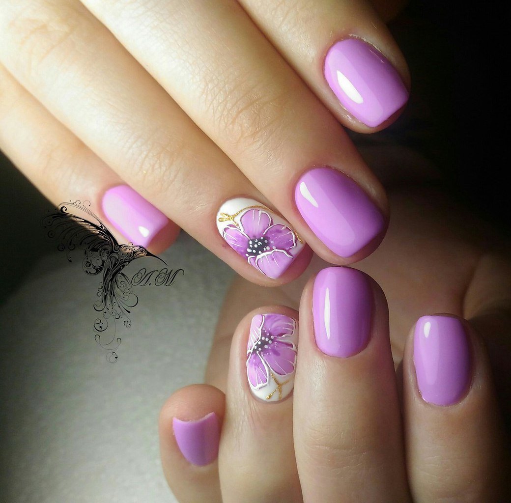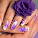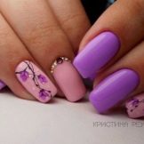 The image of the flowers on the nails - classic manicure. Violets will look great on a lilac background. For decor used darker shades with a matte texture. Complete the picture with black, white and yellow lacquer.