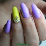 Moon manicure is considered one of the most popular design techniques that can be performed with different shades of lacquer. In this case, it is necessary to choose brighter and more saturated shades of lilac, but, most importantly, do not overdo it, otherwise the decor will turn out to be intrusive and even coarse. Popular combination of lilac with bright yellow color, where the first acts as the main, and the second tone is used to paint the hole. This is ideal for short nails, regardless of their shape. An additional color can also be any shade of lilac.