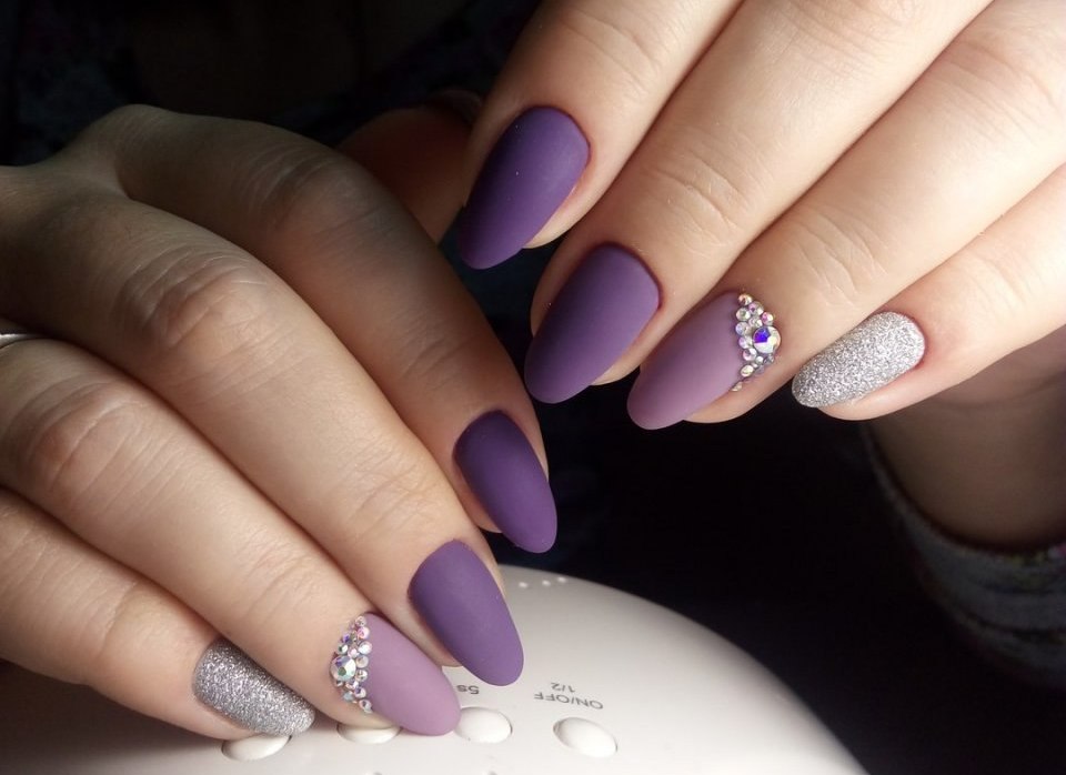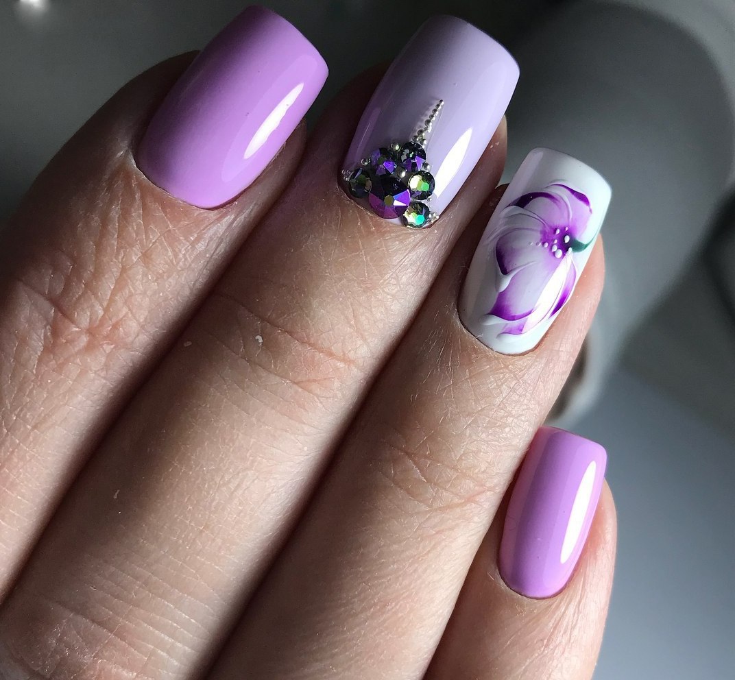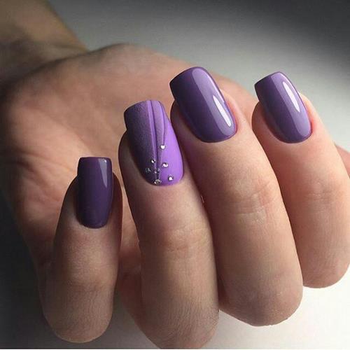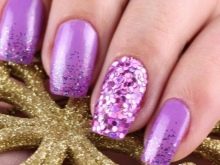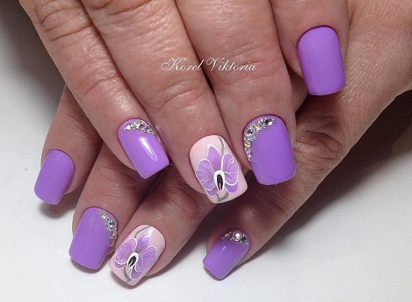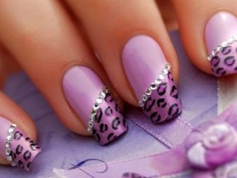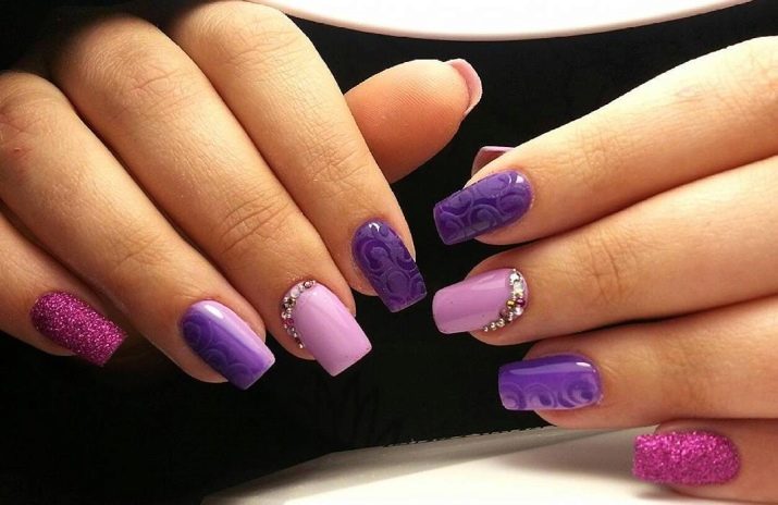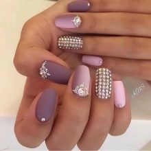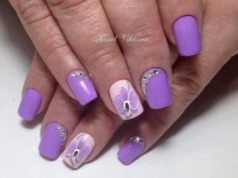 Masters of nail service often use rhinestones for decorating a manicure with a picture. Stones can become both pivotal elements of the composition, and its addition. Shimmer and shine gives the owner of femininity and elegance. With shades of lilac varnish, both transparent (white) and colored elements look wonderful.