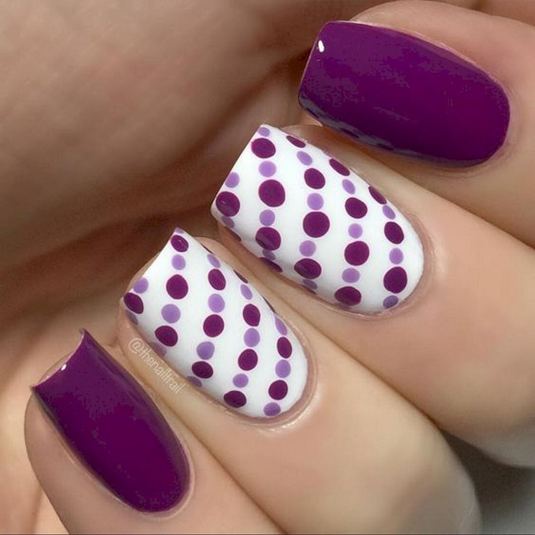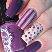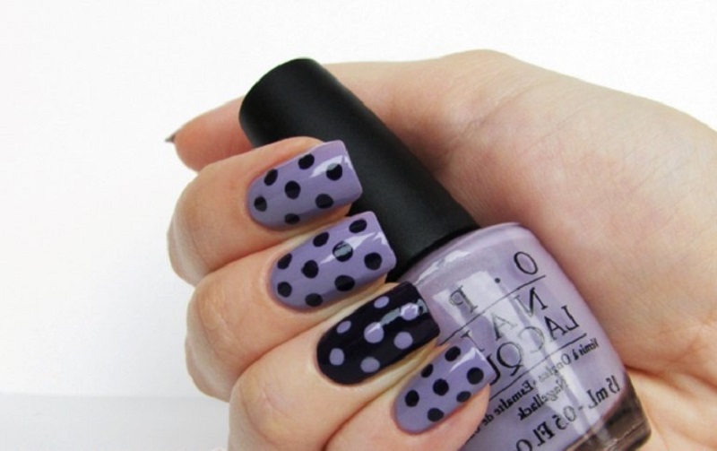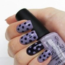 Polka dot manicure is considered a classic and therefore always appropriate. Flirty decor is ideal for feminine and playful girls. In this case, lilac can be combined with any harmonious color. To make the design more noticeable, use the technique of contrast or when choosing a varnish to apply an image, use bright and saturated colors.