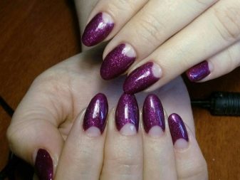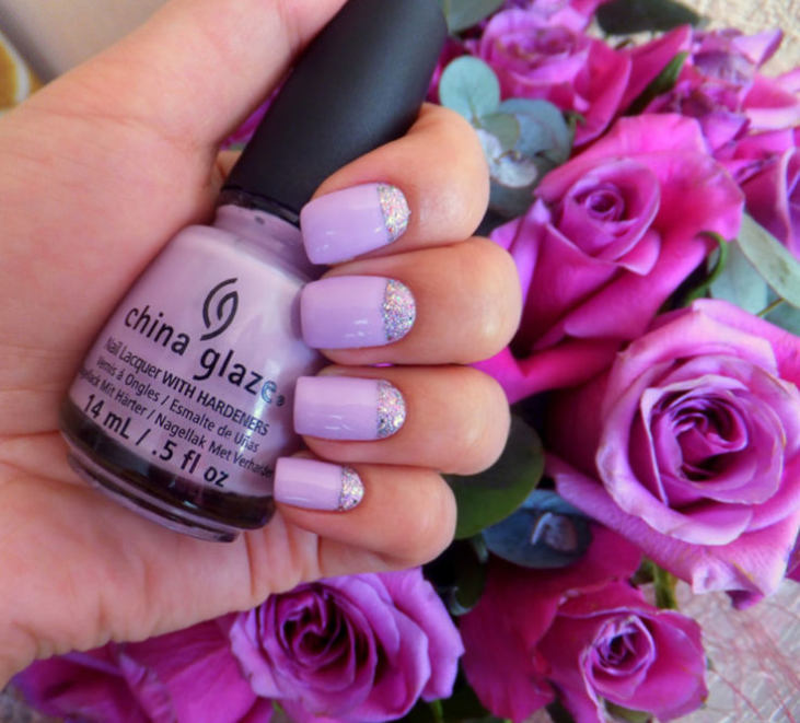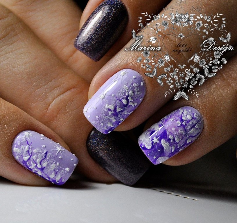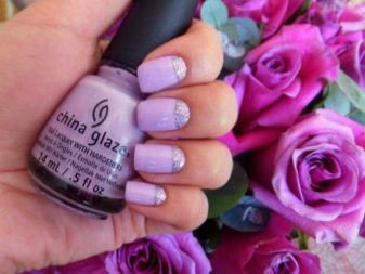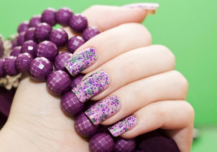 At the peak of popularity are small shining elements that are applied to the nail plate with a special sprayer. They give the design an expressive shimmer. The background of shades of lilac varnish looks great with a variety of sparkles. Given their rich range, each girl can choose the perfect option for their style or specific preferences.