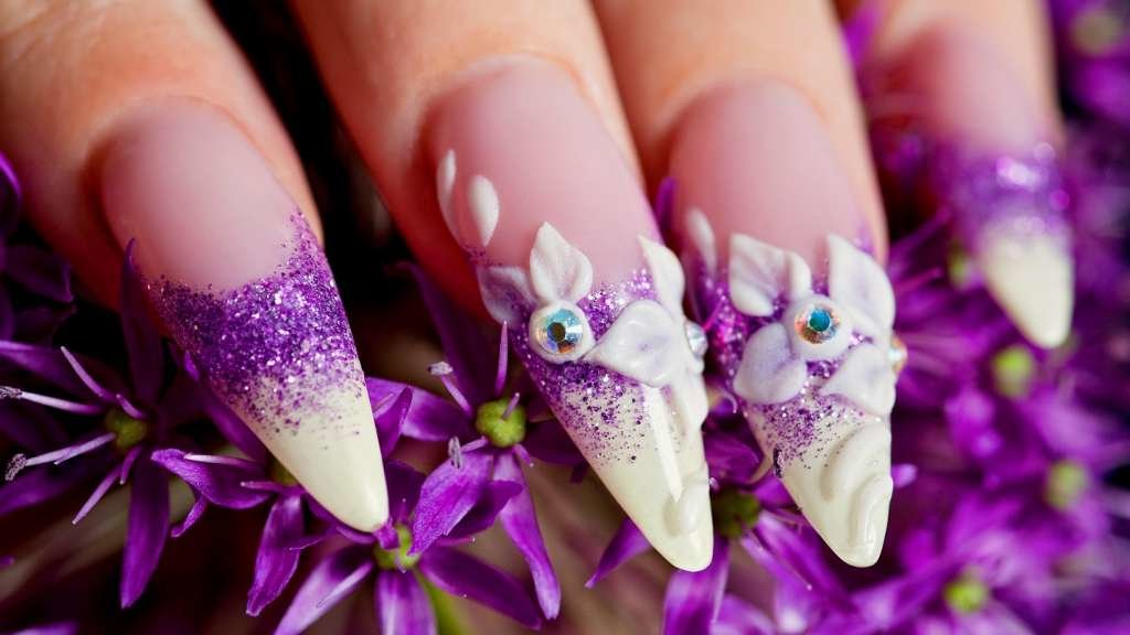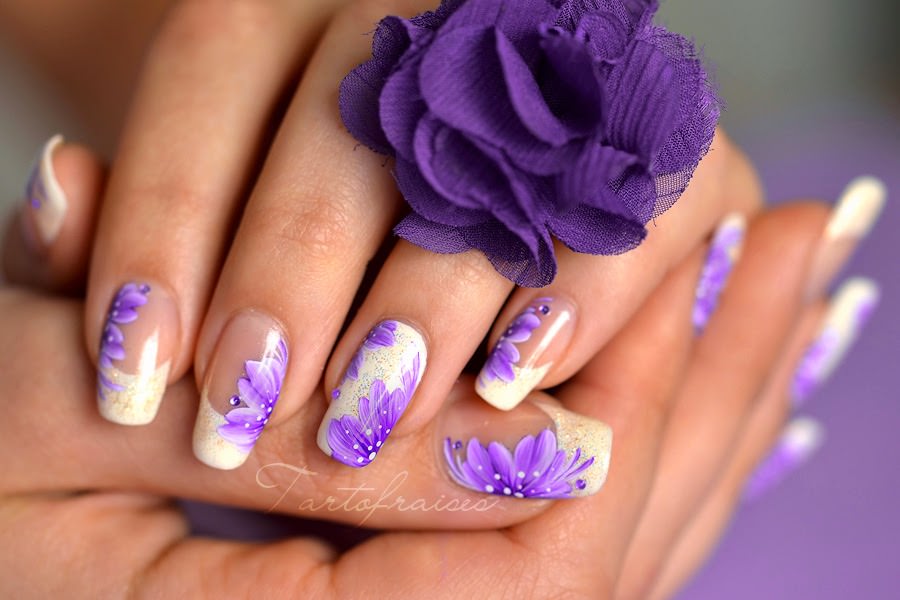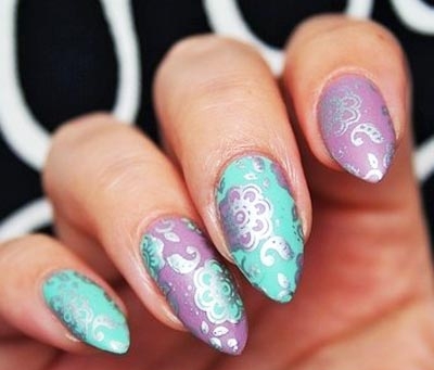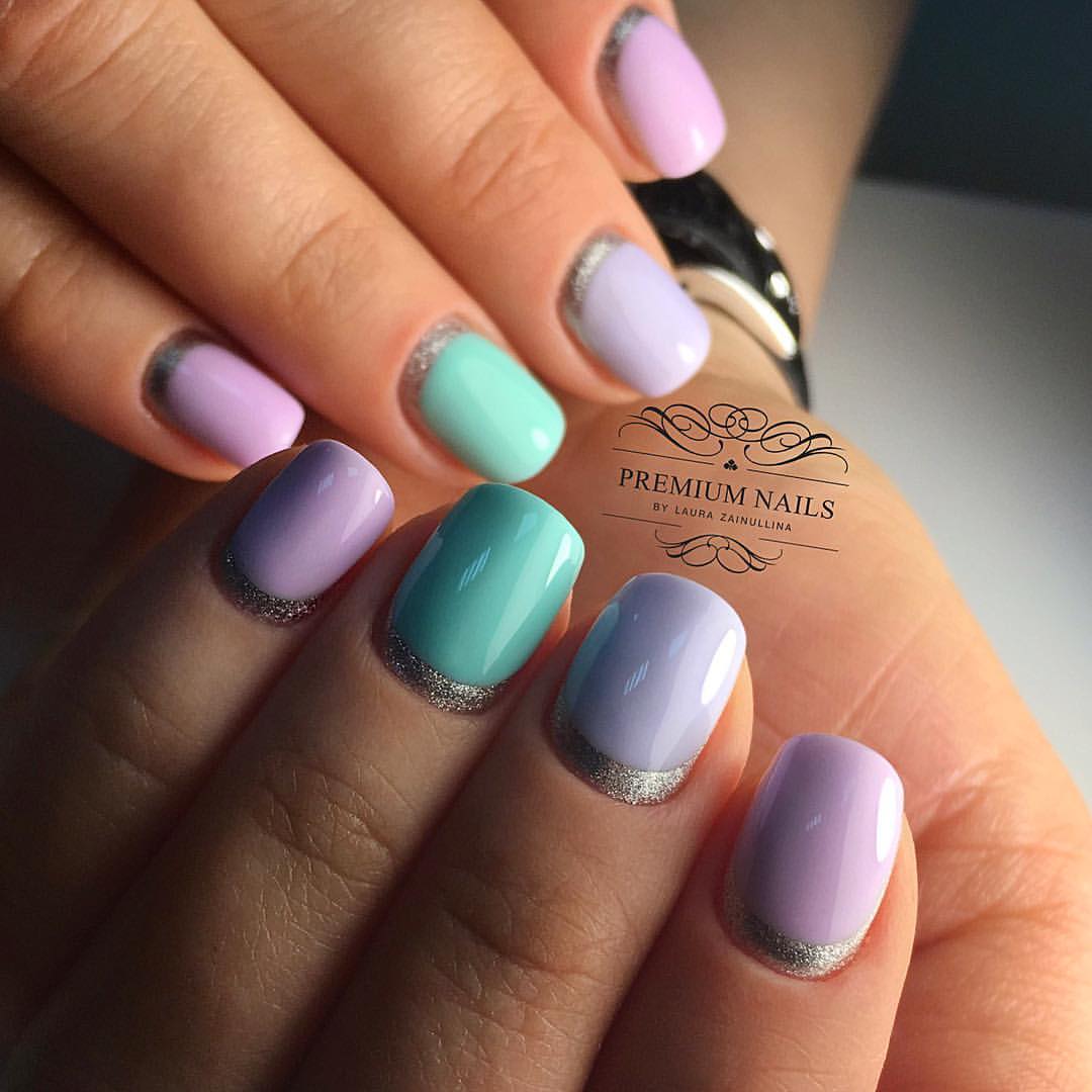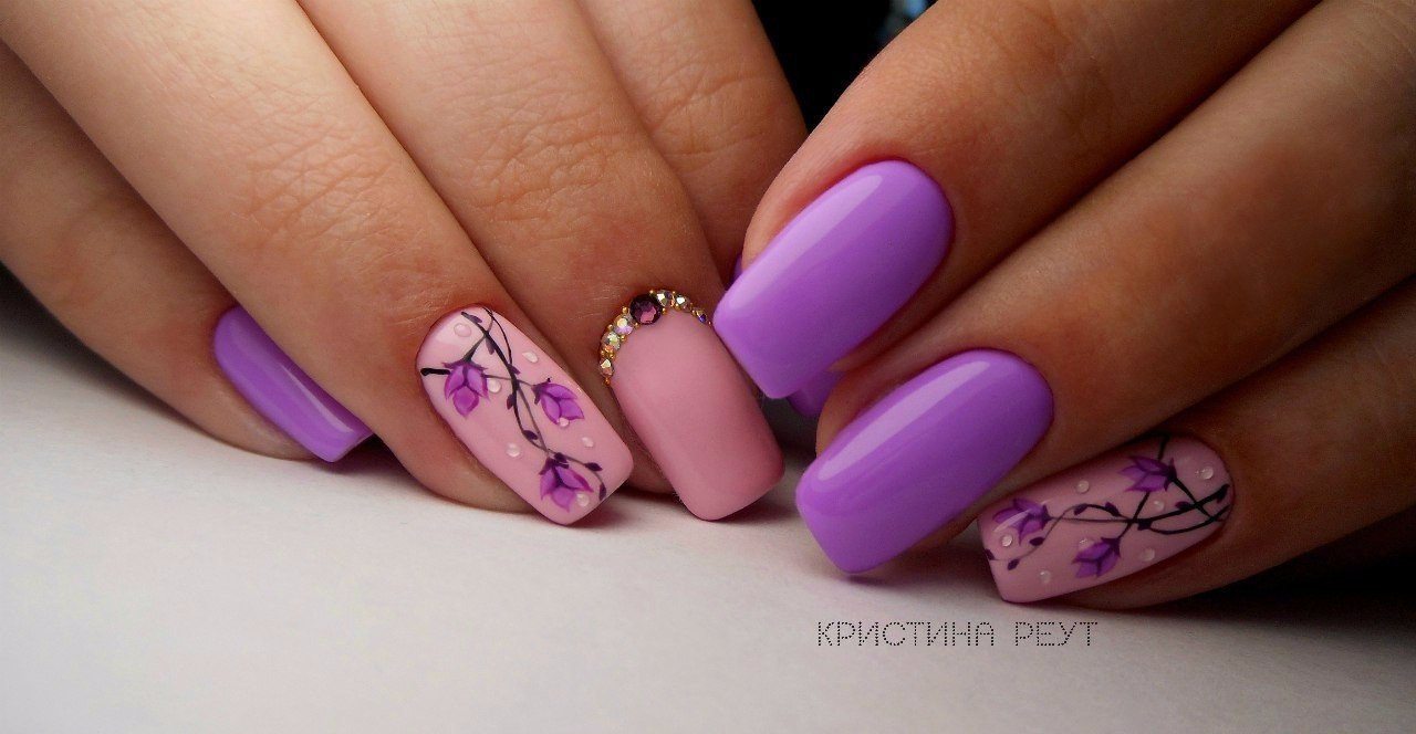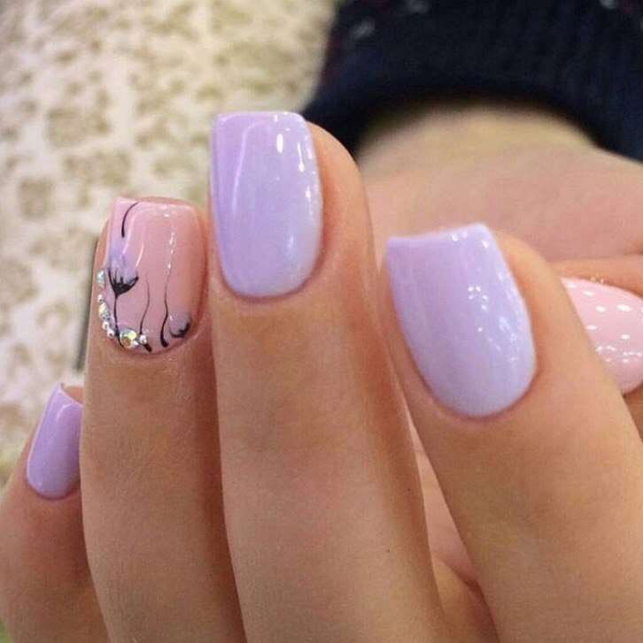 To create a fresh spring decor combine color with a mint tone. You can decorate a stylish flight manicure by combining the pale purple tone with shades of yellow, pink or blue. Gentle tones are actively used for floristic designs.