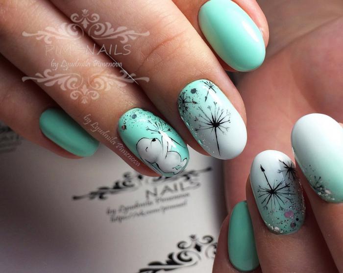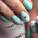 In addition, the manicure looks beautiful, made in a combination of coffee with white and flesh shades. It is fashionable to combine lilac varnish with pink and blue with dairy. In this case, accents can be placed in both white and silver lacquer. Black print changes the mood of the design, it makes it elegant or even solemn.